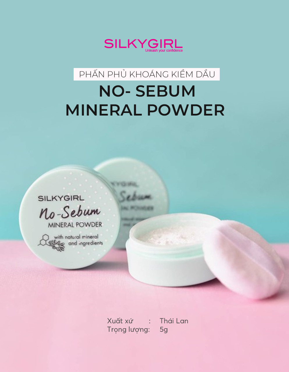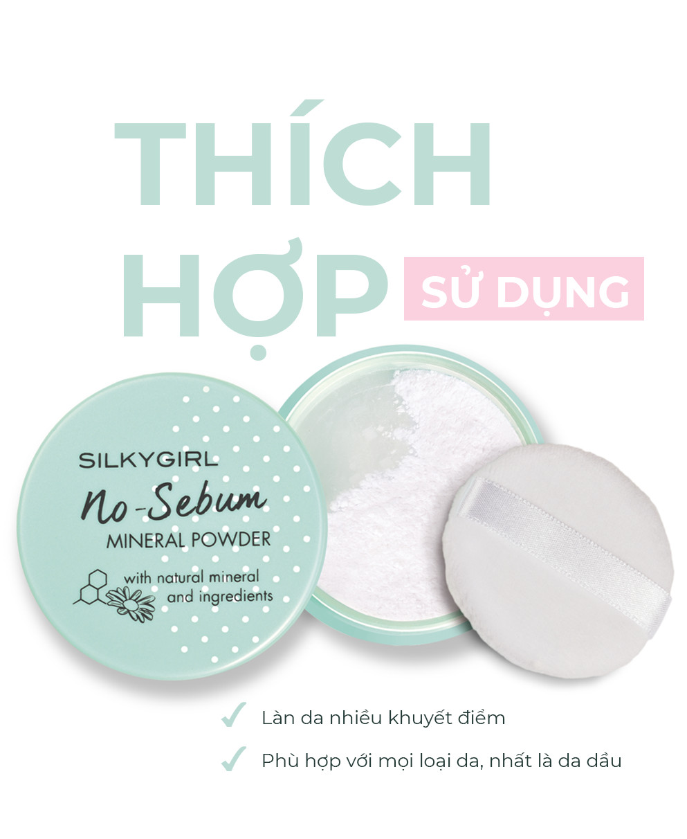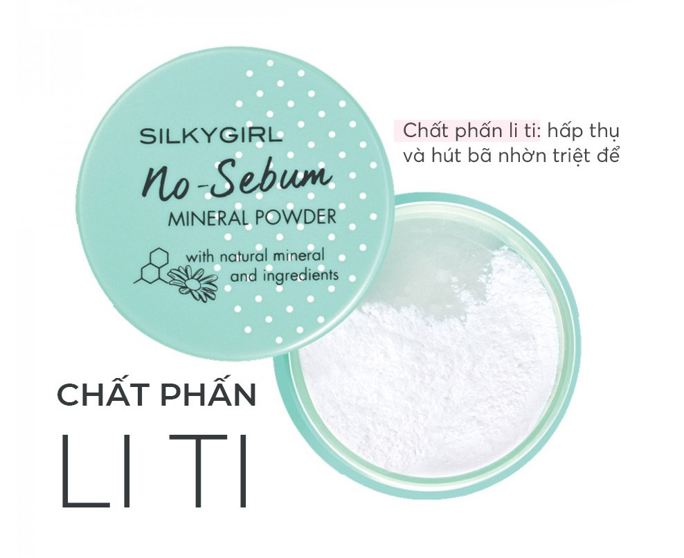 - Phấn Phủ Khoáng SILKYGIRL No-Sebum Mineral Powder với công thức cải tiến mới chứa các hạt phấn li ti siêu mịn có khả năng hấp thụ lượng bã nhờn một cách triệt để. Nhờ đó mang lại cho bạn làn da không nhờn rít, bóng dầu đồng thời còn bảo vệ da khỏi tác hại môi trường nhờ thành phần khoáng chất lành tính từ hoa cúc la mã, hạt hoa hướng dương & Vitamin E giúp chống oxy hóa, kháng viêm cho làn da.
