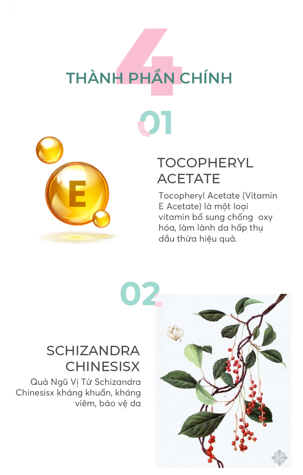 Thành phần: Talc, Aluminum Starch Octenylsuccinate, Silica, Mica, Chlorphenesin, Hydroxyapatite, Allantoin, Dimethicone, Zinc Oxide, BHT, Bisabolol, Tocopheryl Acetate, Helianthus Annuus (Sunflower) Seed Oil, Butylene Glycol, Schizandra Chinensis Fruit Extract.