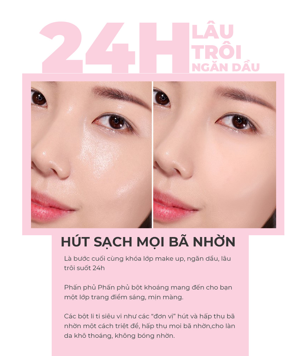 - Sản phẩm có kết cấu dạng phấn bột với các hạt li ti siêu nhỏ, khi apply lên bề mặt da lớp phấn phủ đều lên toàn bộ gương mặt mang lại lớp nền mịn lì, khô thoáng.