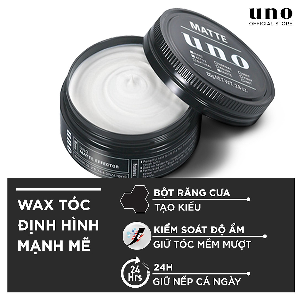 - Sáp Định Hình Mái Tóc Uno Matte Effector giúp bạn có thể thoải mái tạo kiểu vuốt dựng mạnh mẽ, cứng cáp, để lại độ bóng mờ đầy phong cách nhưng vẫn giữ cho mái tóc bồng bềnh tự nhiên, không làm cứng hay khô xơ tóc.