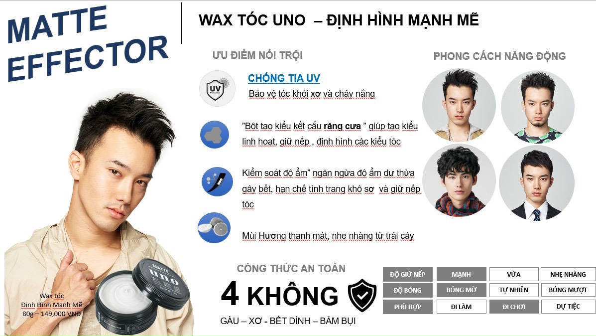 - Sáp Định Hình Mái Tóc Uno Matte Effector phù hợp trong mọi tình huống: đi học, đi chơi, đi làm…
