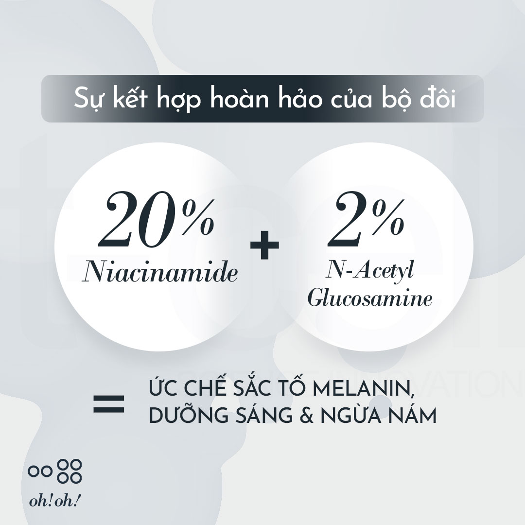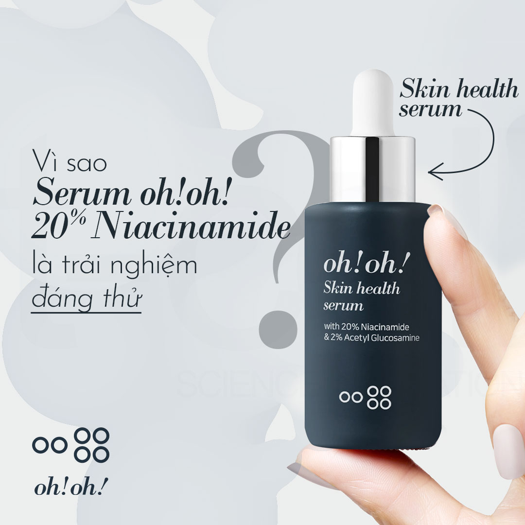 Tinh Chất Dưỡng Sáng Da, Giảm Thâm Nám oh!oh! Skin Health Serum là sản phẩm serum đến từ thương hiệu mỹ phẩm oh!oh! của Hàn Quốc, chứa nồng độ 20% Niacinamide (vitamin B3) giúp làm sáng da, giảm mụn, hỗ trợ điều tiết dầu thừa, ngừa bít tắc chân lông. Kết hợp cùng 2% N- Acetyl- Glucosamine (NAG) hỗ trợ cải thiện đốm sắc tố, giúp da sáng hơn, đều màu hơn, ngoài ra còn có công dụng làm giảm mụn. Serum thấm nhanh, không nhờn dính như các sản phẩm serum Niacinamide khác trên thị trường, lý tưởng dành cho làn da dầu mụn.