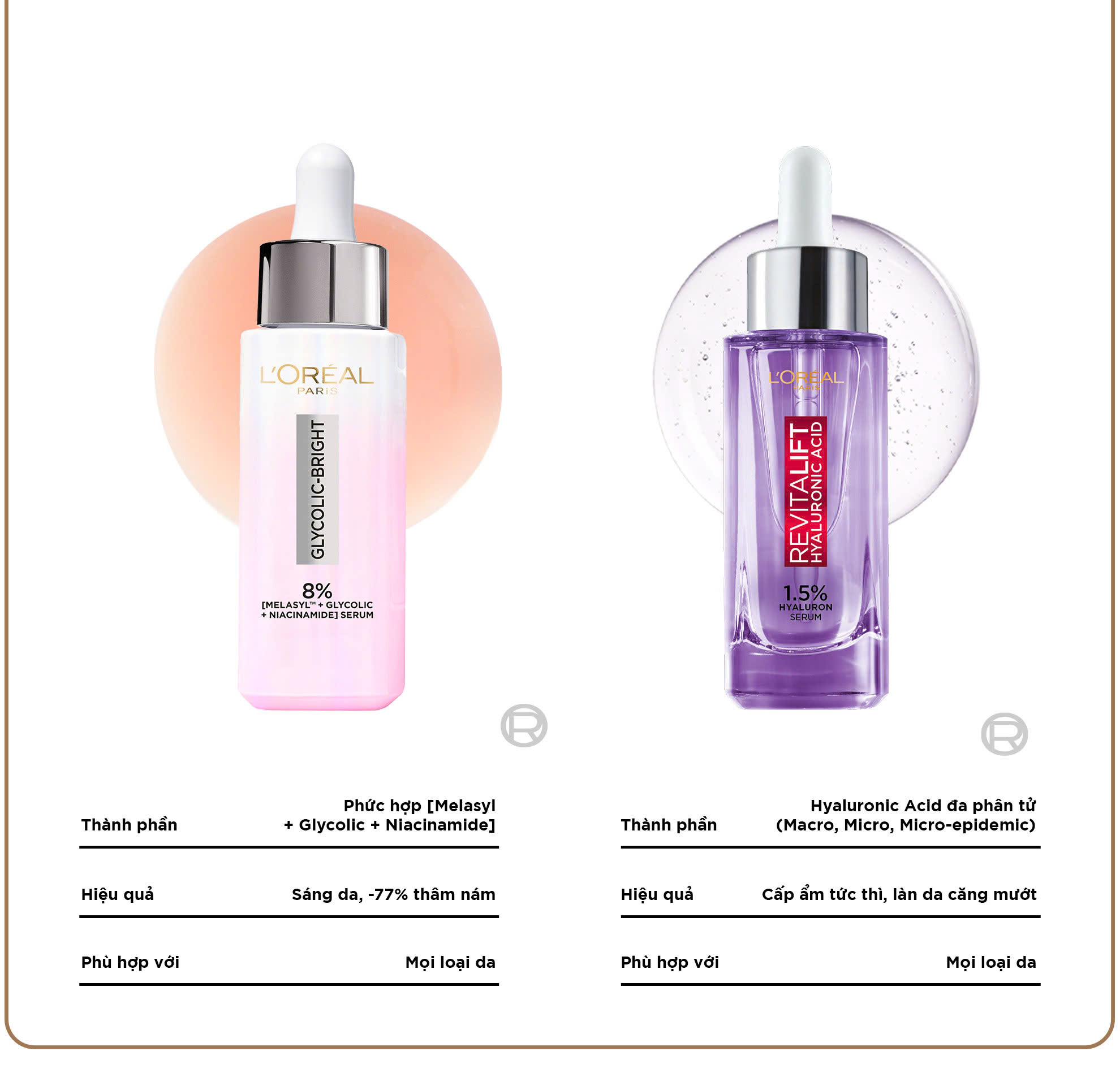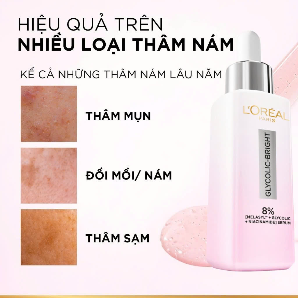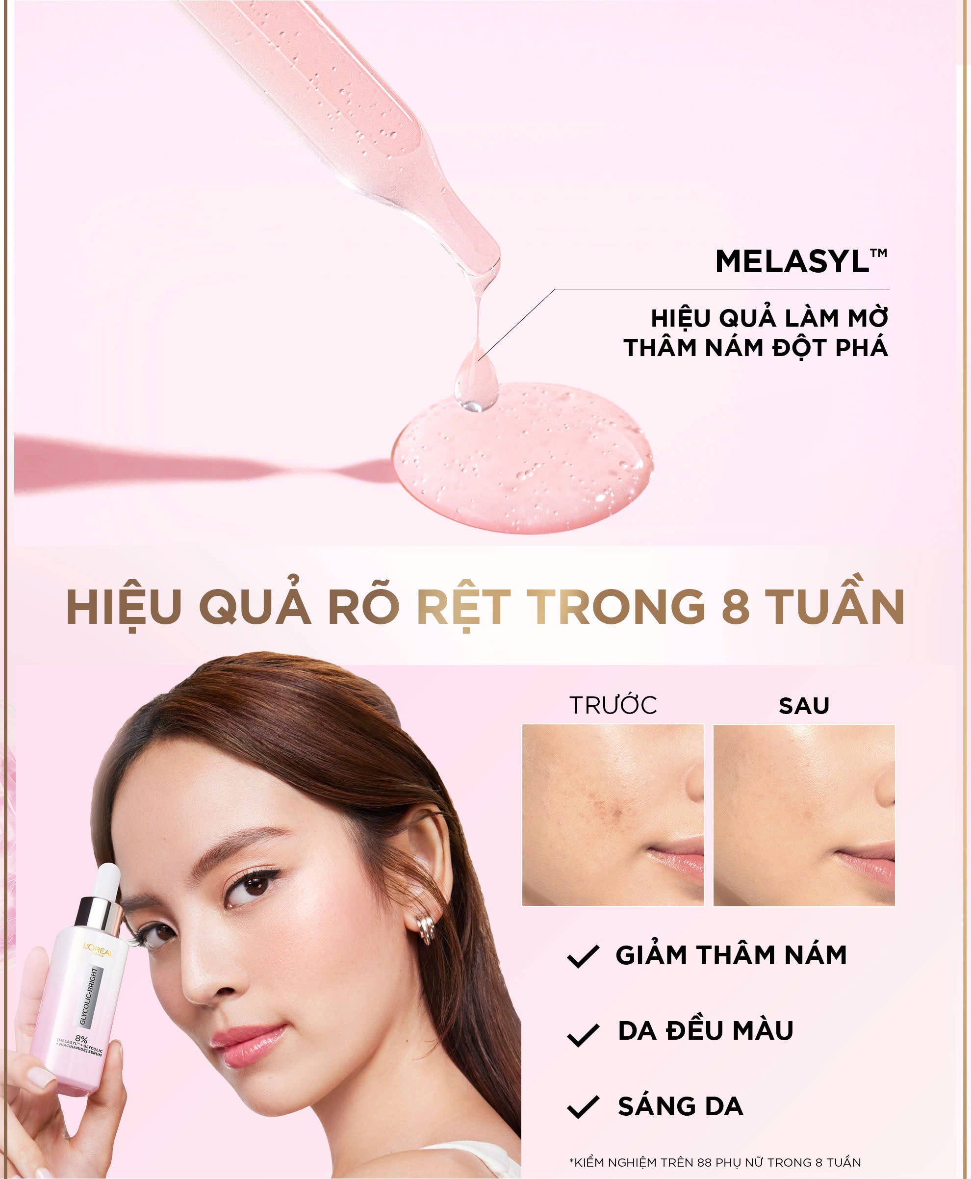 Serum L'Oreal Paris Dưỡng Sáng Và Mờ Thâm Nám là sản phẩm tinh chất dưỡng da đến từ thương hiệu mỹ phẩm L’Oreal Paris của Pháp, với thành phần đột phá sáng da MelasylTM từ viện nghiên cứu L’oreal Paris – hiệu quả hơn 5 hoạt chất sáng da phổ biến, cùng phức hợp hoạt chất 8% [Melasyl+Glycolic+Niacinamide] giúp mang đến khả năng vượt trội GIẢM 77% THÂM MỤN & NÁM*.