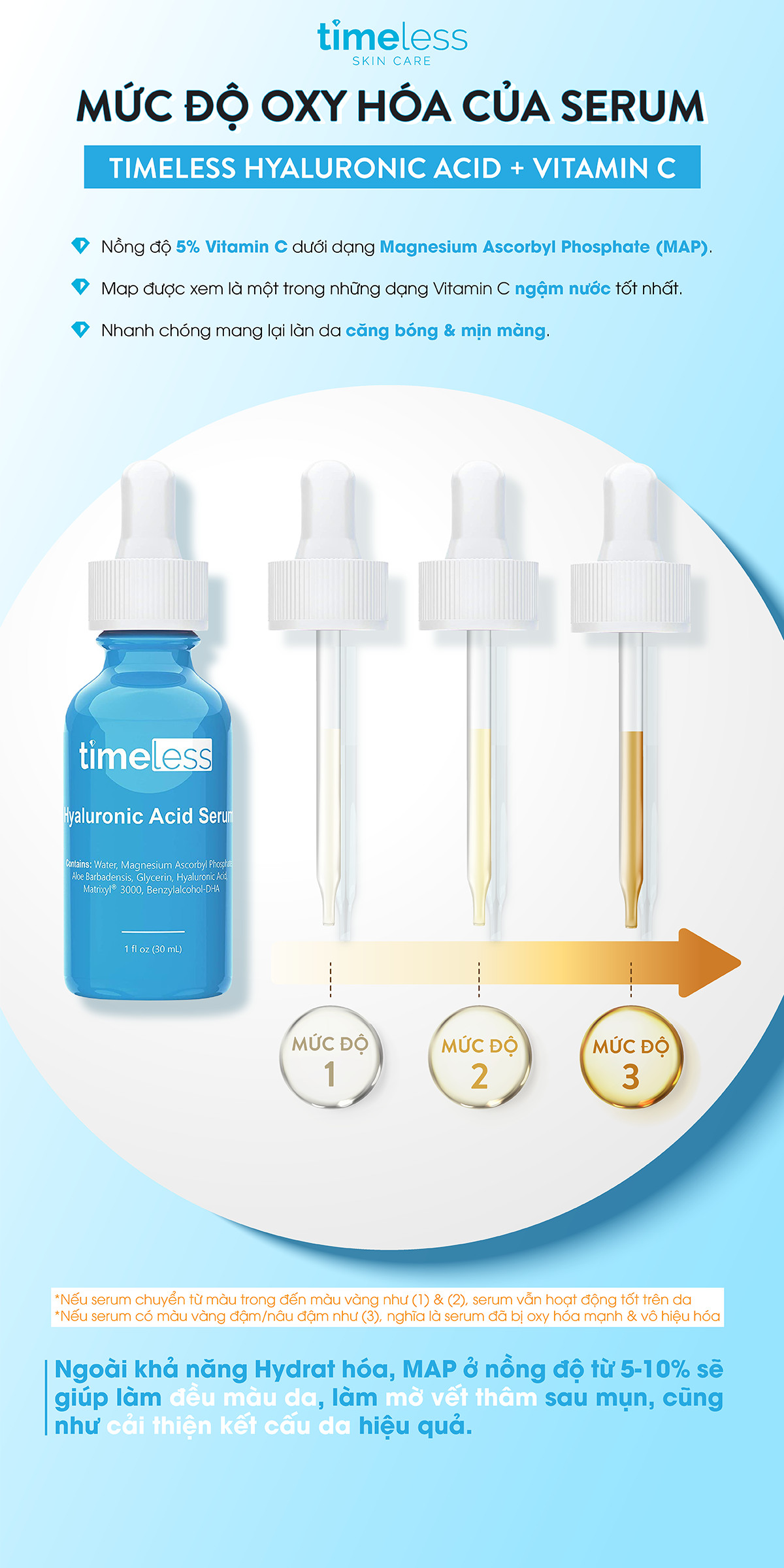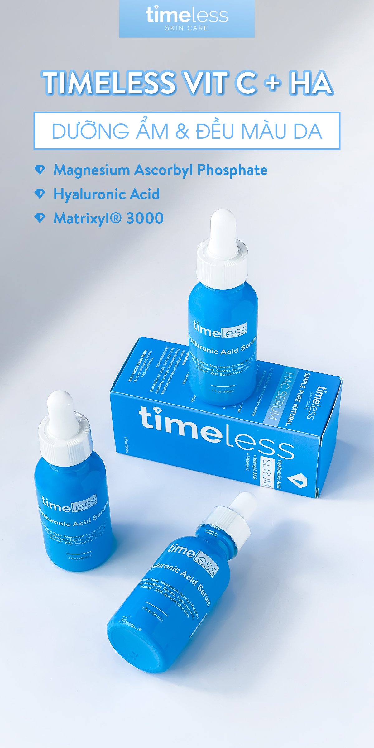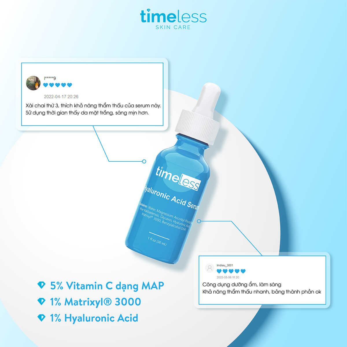 Tinh Chất Cấp Ẩm, Dưỡng Trắng Da Timeless Hyaluronic Acid + Vitamin C Serum là dòng tinh chất dưỡng đến từ thương hiệu Timeless - thương hiệu chuyên về dưỡng da tại Mỹ. với công thức chứa Hyaluronic Acid & Vitamin C ở dạng MAP có tác dụng tái tạo collagen, dưỡng trắng, cấp ẩm tức thì và giữ nước mang đến làn da sáng mịn, căng mọng.