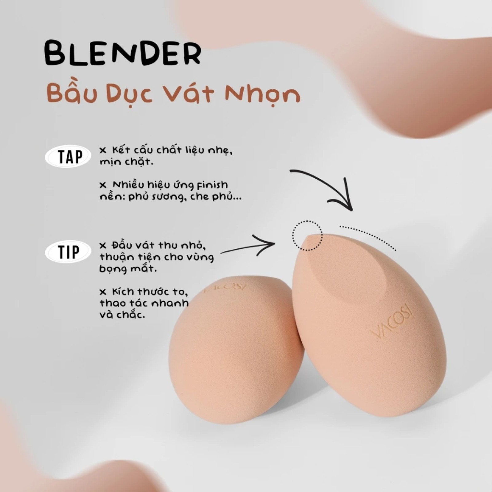 Dùng các mặt khác nhau của mút cho từng vùng da: mặt lớn cho má/trán, cạnh nhỏ cho mũi/mắt.