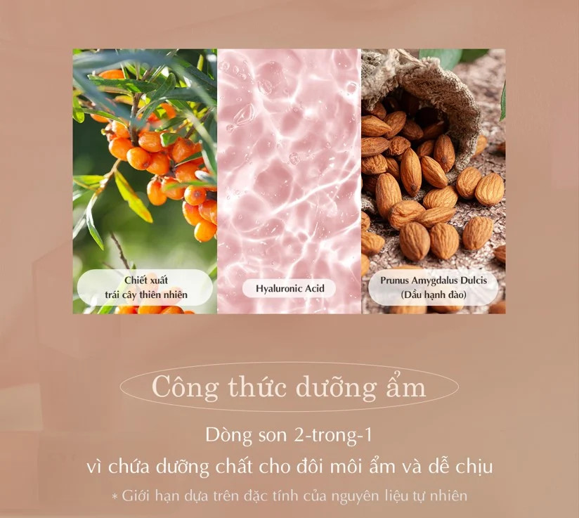 - Hyaluronic Acid: Giúp đôi môi mịn màng và căng tràn sức sống cả ngày bởi chức năng cấp ẩm sâu.