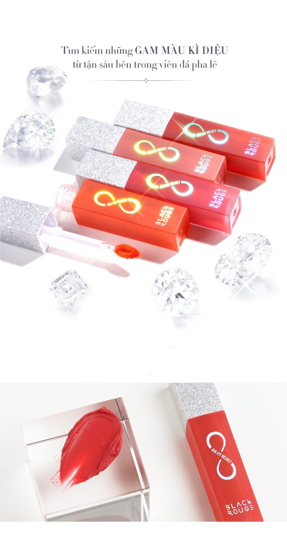 - Son kem lì Black Rouge Air Fit Velvet Tint với chất son velvet tint mịn lì, trơn mượt trên môi quen thuộc, son có kết cấu dễ tán với đầu cọ tên tiến, lớp finish để lại lớp tint nhẹ và set lì nhanh chóng mà không gây khô môi hay nặng môi nhưng vẫn đủ độ lì tạo nên một bờ môi căng mọng đầy quyến rũ.