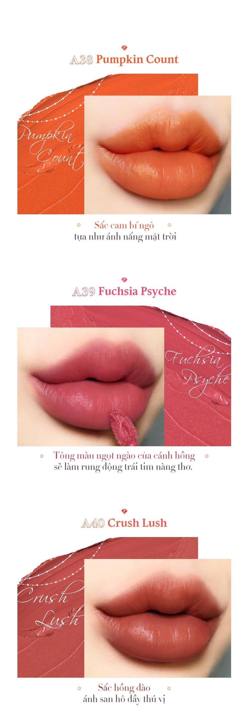 - Son có kết cấu velvet tint khi thoa lên môi rất mềm mịn, lớp finish xốp lì.