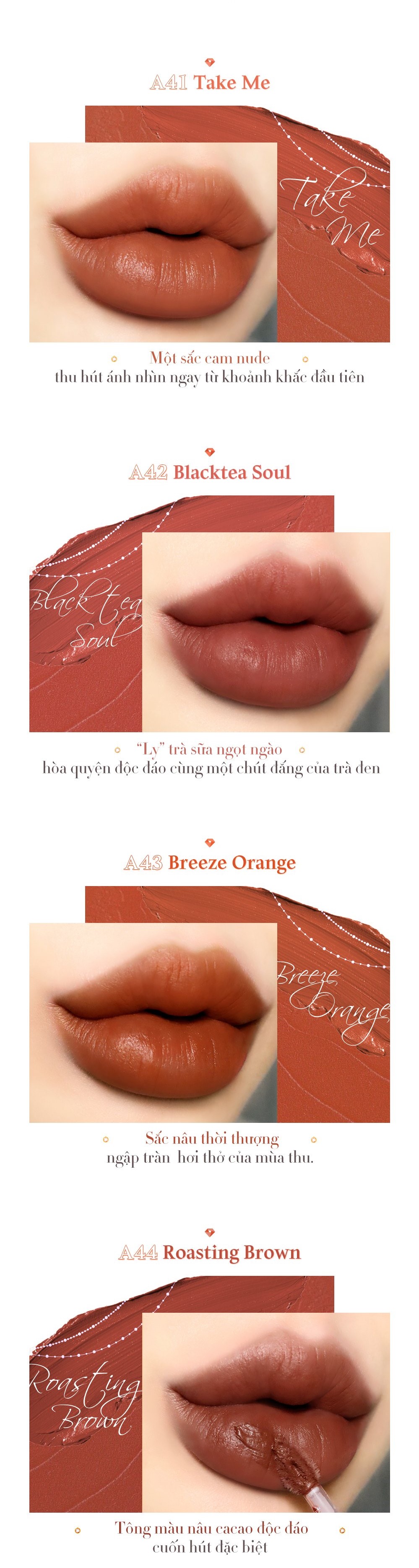 A41 - Take Me: Một sắc cam nude cuốn hút mạnh mẽ là sự hoà trộn giữa sắc cam và tông nude ngọt lịm. Dù là tông cam nude nhưng vẫn rất dễ dùng, không hề kén da giúp bạn thêm trẻ trung, tươi sáng.