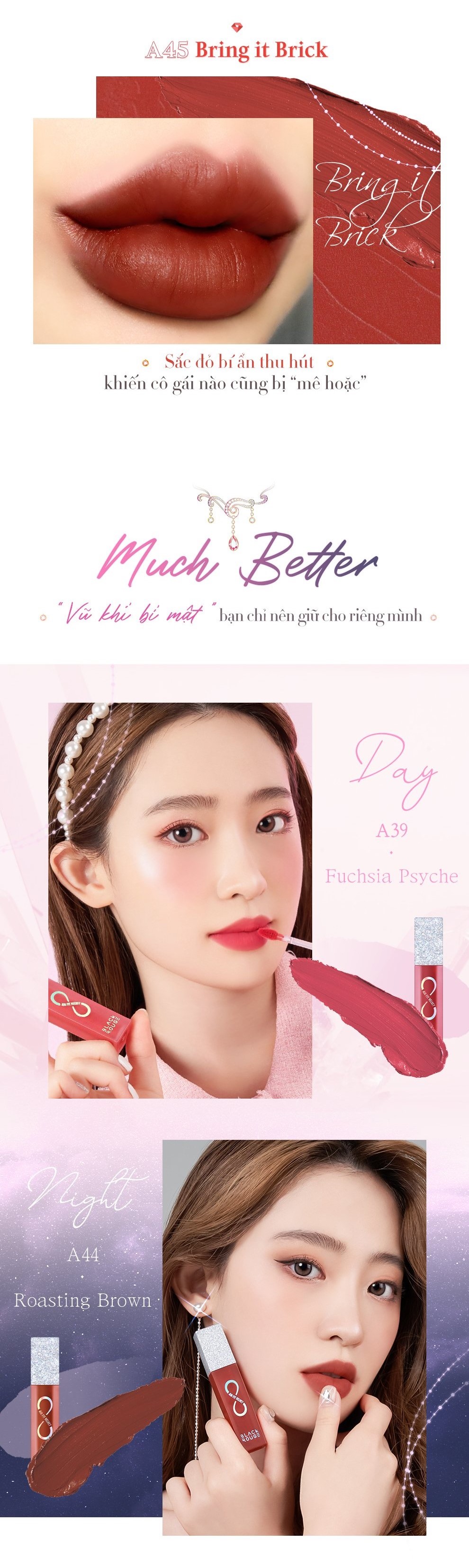 - Phía trên thân son gây ấn tượng khi in số 8 trên thân son, khi đặt ngang thì lại là một biểu tượng vô cực, mang thông điệp chị em sẽ mê mẩn Air Fit Velvet Tint Season 8 “không lối thoát” một khi đã sở hữu.