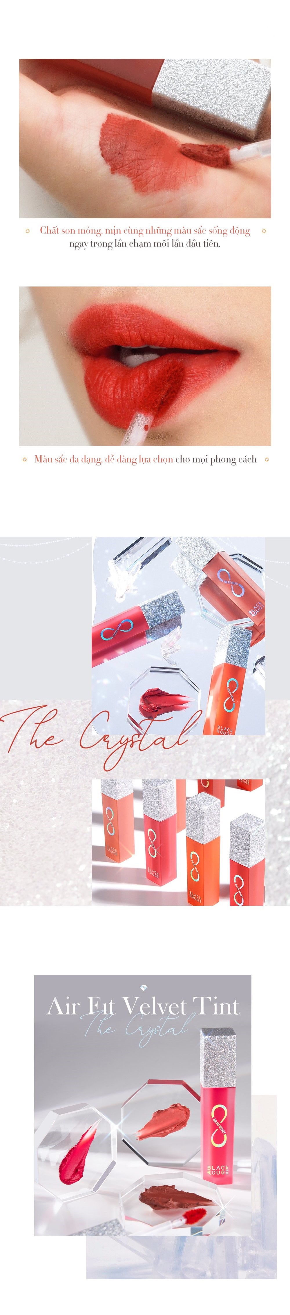 Son Kem Lì Black Rouge Air Fit Velvet Tint The Crystal là son kem lì đến từ thương hiệu Black Rouge nằm trong phiên bản Version 8 có tên gọi The Crystal thuộc dòng son Air Fit Velvet Tint quen thuộc, với rất nhiều sự cải tiến về chất son lẫn màu son, hứa hẹn sẽ mang đến những trải nghiệm mới mẻ và hài lòng, giúp các nàng trở nên xinh đẹp, rạng ngời và quyến rũ hơn.