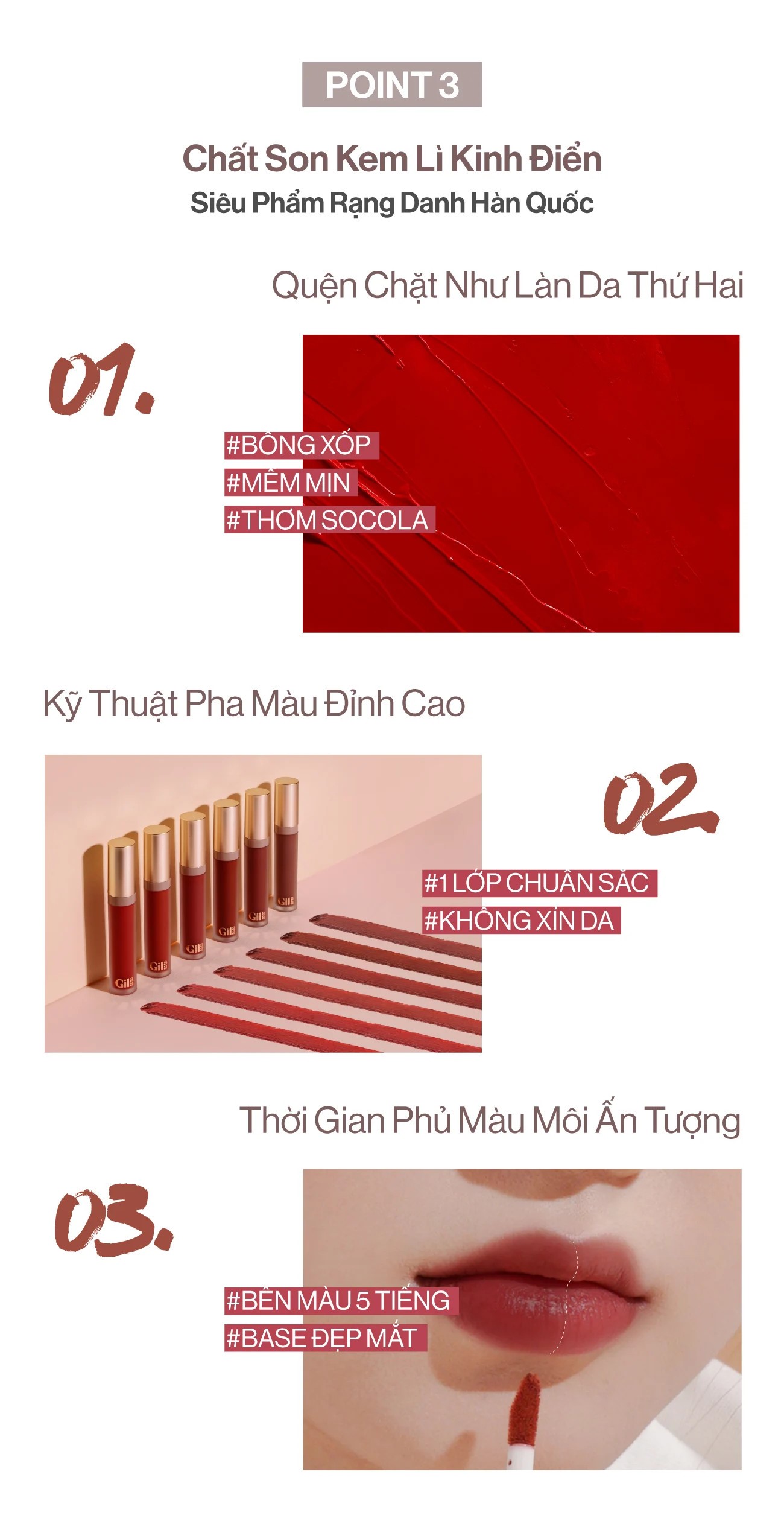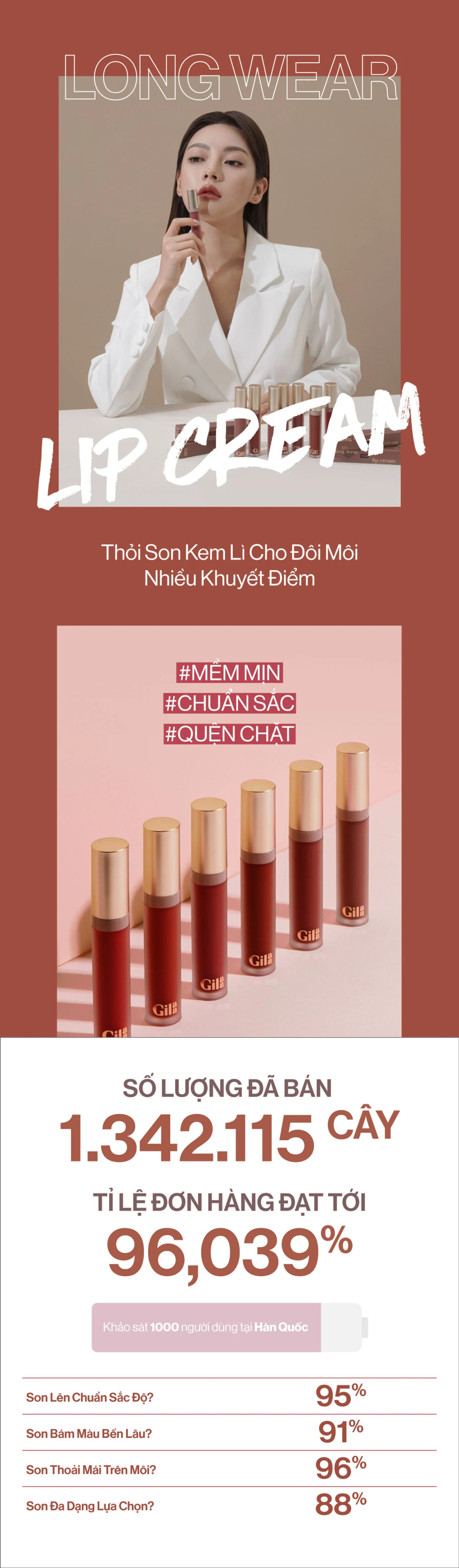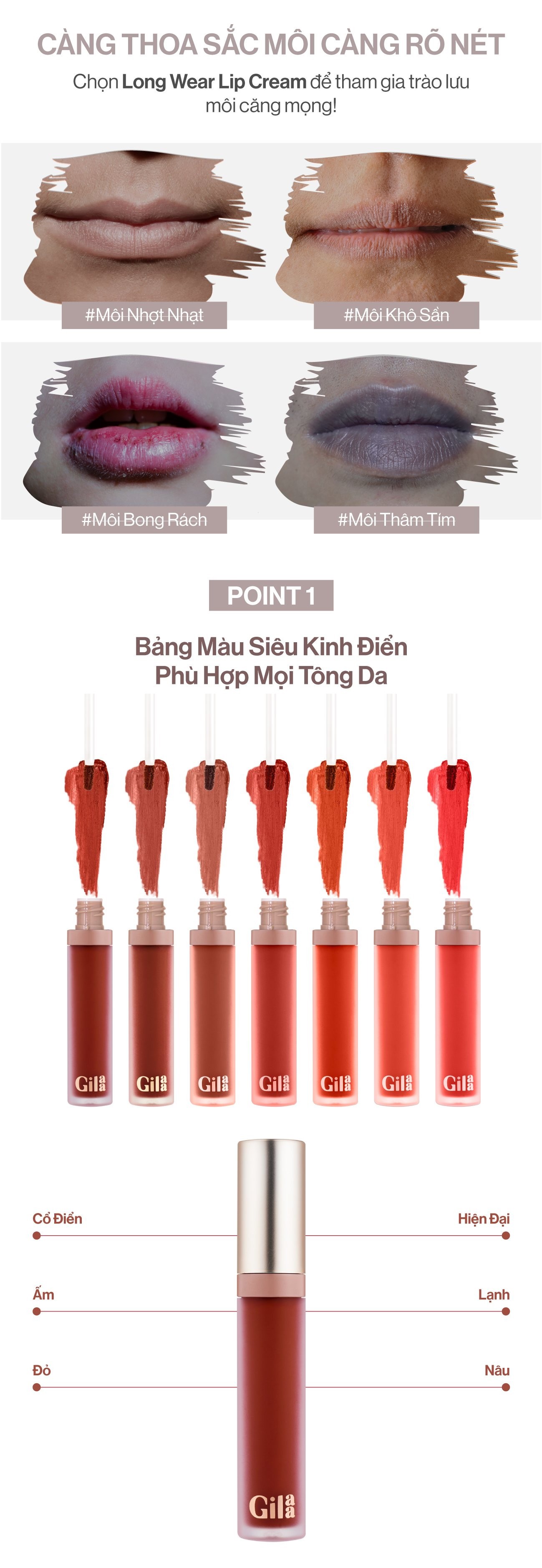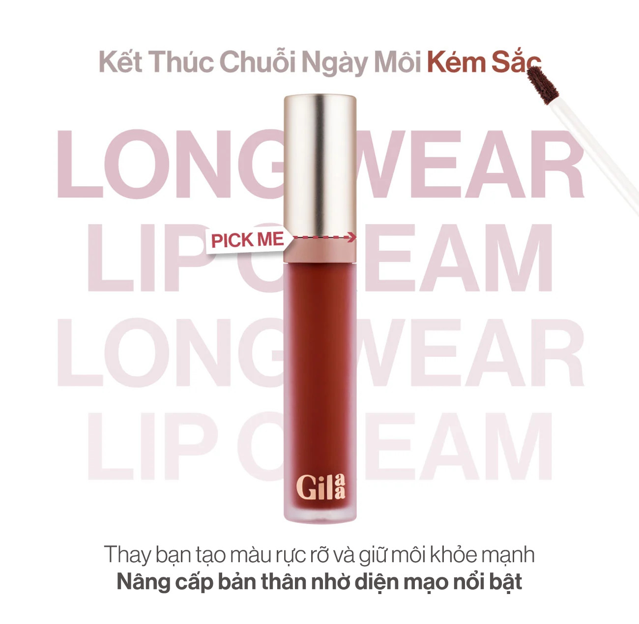 Son kem lì Gilaa Long Wear Lip Cream là dòng son kem lì đến từ thương hiệu Gilaa có chất son bông xốp mềm mịn, độ bám màu cao, giữ màu lâu trên môi cùng nhiều thành phần dưỡng chất giúp dưỡng ẩm và hỗ trợ trị thâm môi hiệu quả. Bảng màu son Gilla đa dạng, từ những gam màu đỏ trẻ trung đến sắc đỏ nâu sang trọng, quyến rũ dễ dàng phối hợp nhiều phong cách khác nhau, tạo cho bạn một phong cách riêng ấn tượng.