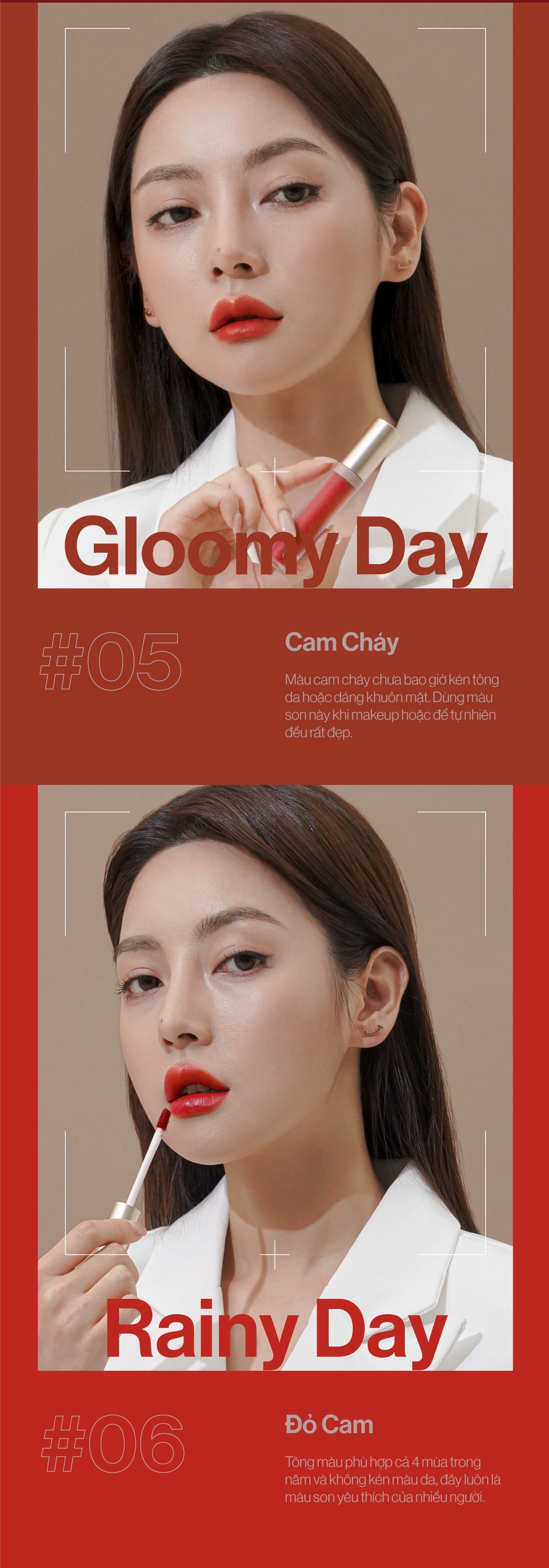 • 06 Rainy Day: Đỏ cam: sắc đỏ truyền thống trẻ trung không kén da, màu son yêu thích của phái đẹp.