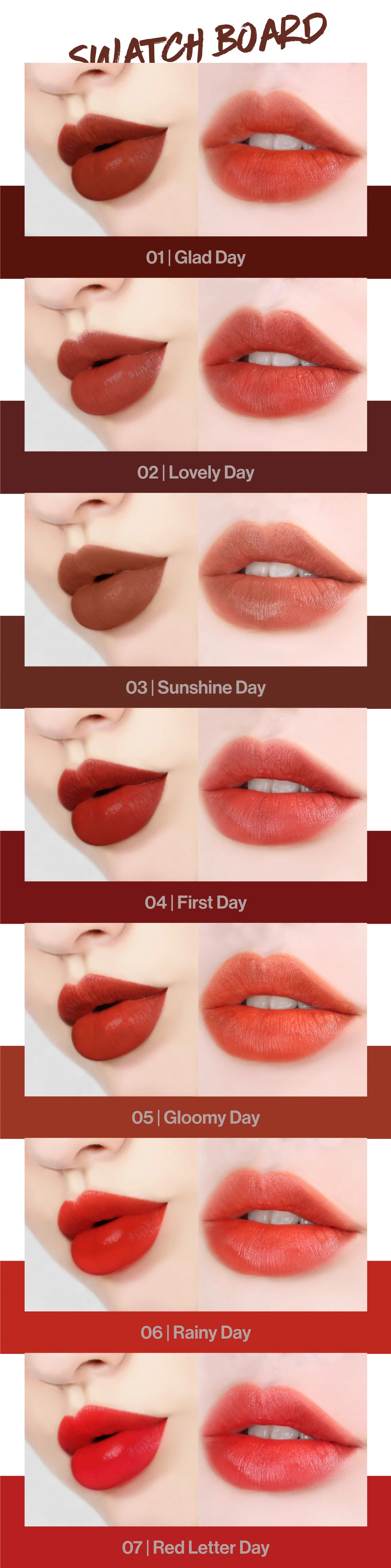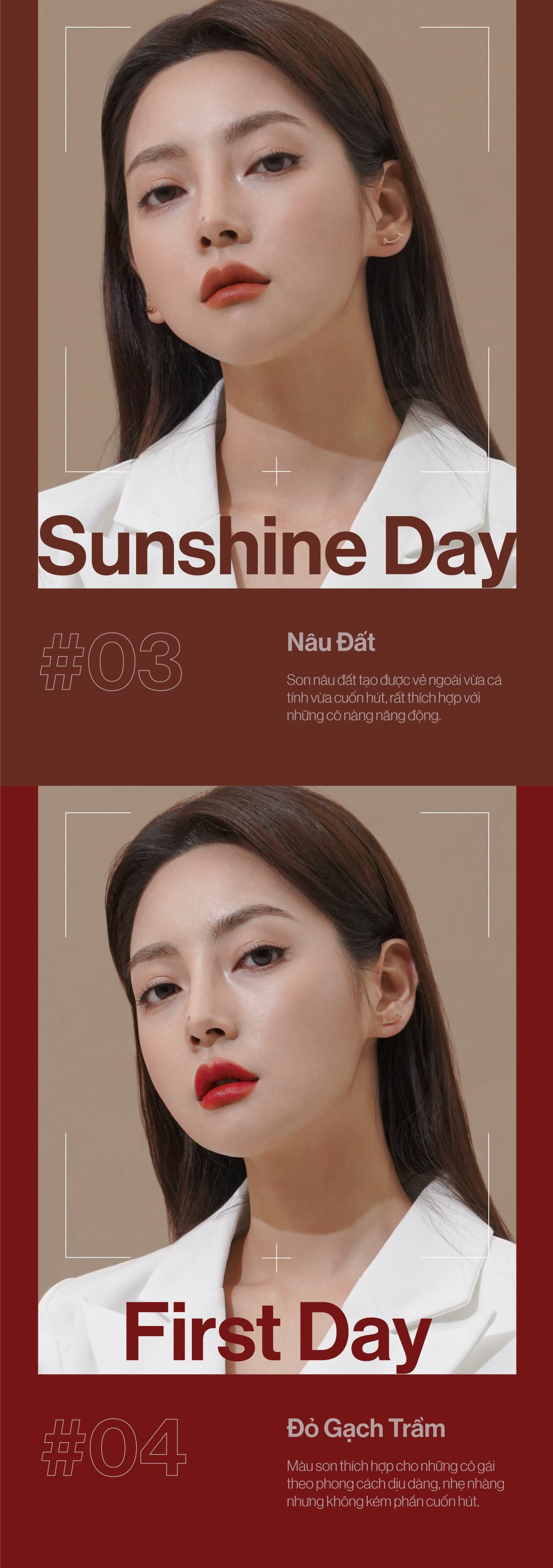 • 02 Lovely Day: màu đỏ nâu trầm khi đánh lòng môi rất xinh, khi thoa full môi kết hợp make up mắt khói sẽ rất tinh tế, cuốn hút.