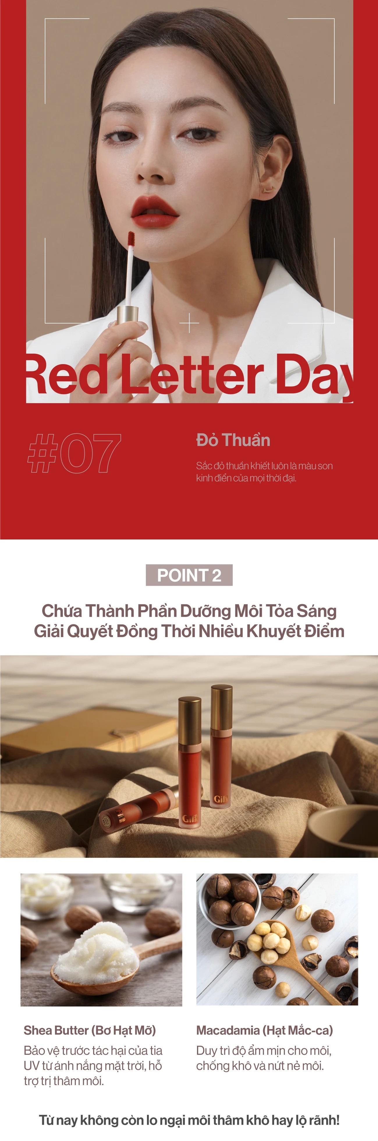 • 07 Red Letter Day: Đỏ thuần: sắc đỏ thuần khiết màu son kinh điển của mọi thời đại.