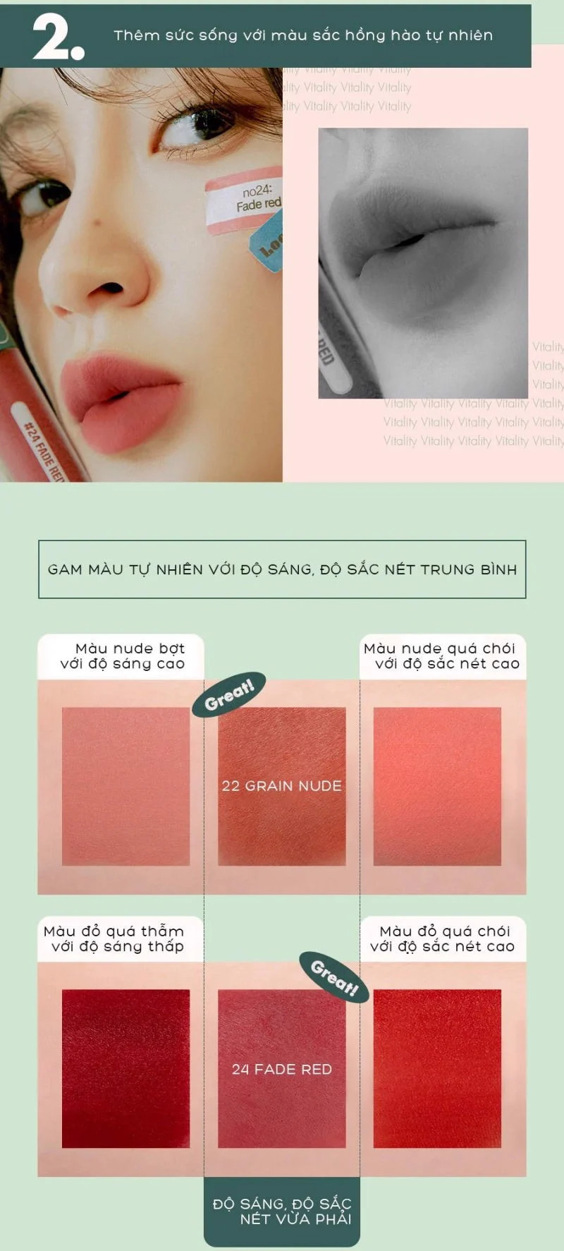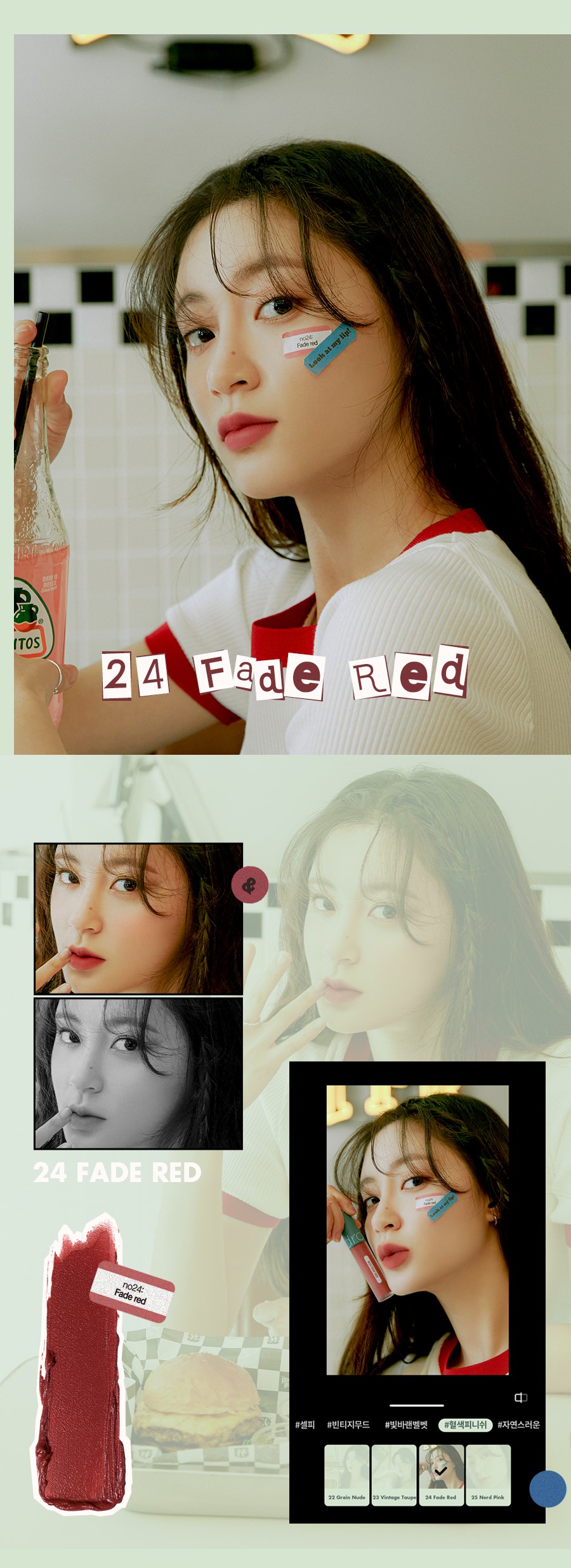 - Màu #24 Fade Red: Màu đỏ không quá chói, phù hợp với những lan da trắng.