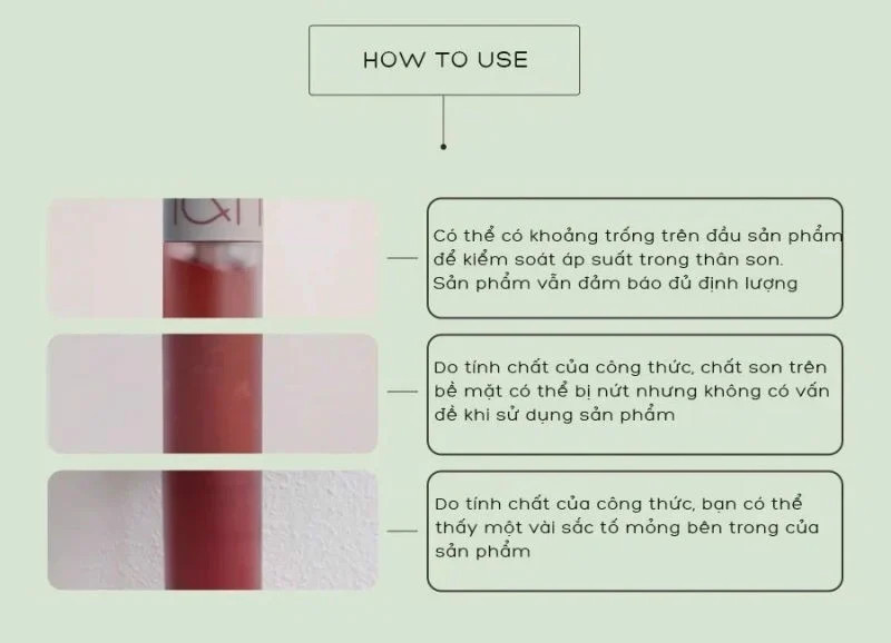 - Kết cấu son mềm mịn, lướt nhẹ trên môi một cách dễ dàng và không bết dính. Đồng thời, chất son mịn cũng giúp làm mờ rãnh môi hiệu quả, thích hợp cho những đôi môi khô, thiếu ẩm.