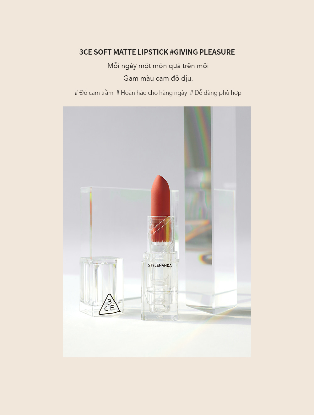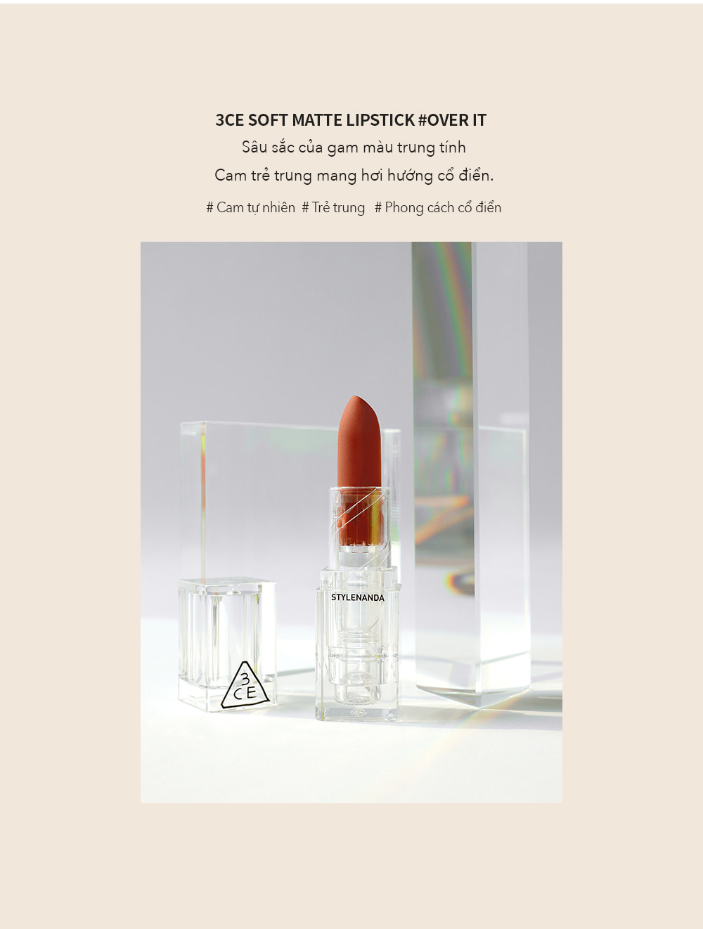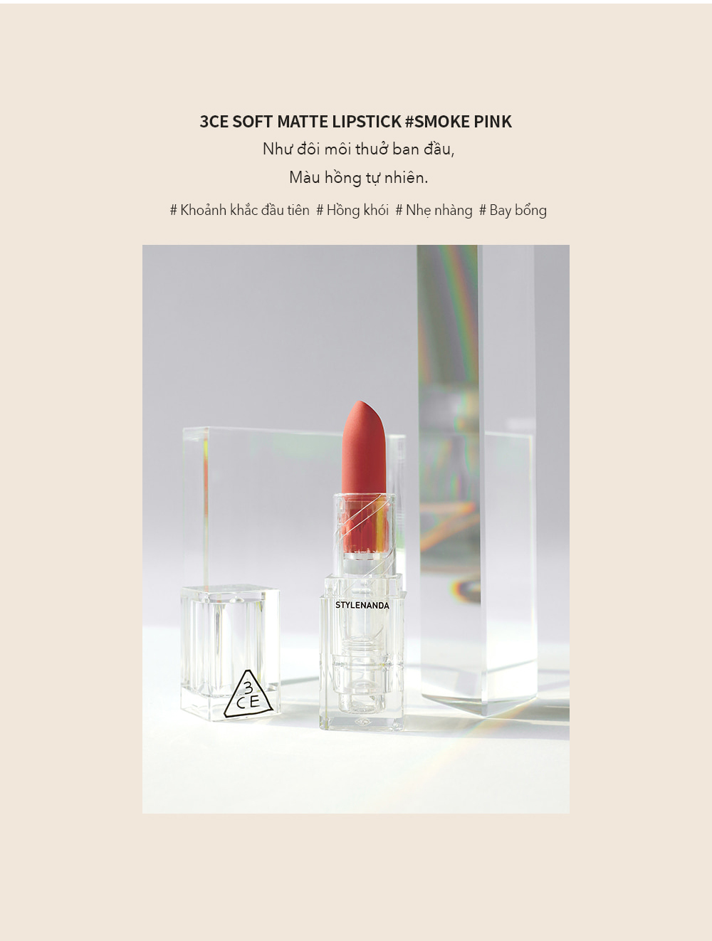 - Son thỏi lì 3CE Soft Matte Lipstick nằm trong bộ sưu tập Clear Layer Edition vừa mới ra mắt của thương hiệu 3CE.