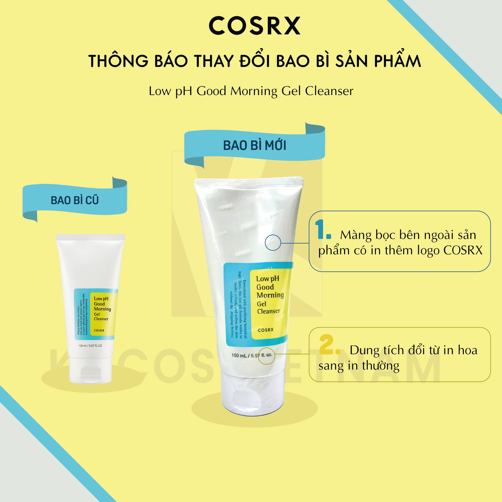 - Sữa Rửa Mặt Dạng Gel Dịu Nhẹ Cosrx Low pH Good Morning Gel Cleanser với thành phần chiết xuất từ thiên nhiên, giúp làm sạch mọi bụi bẩn, lớp trang điểm, dầu nhờn trên da.