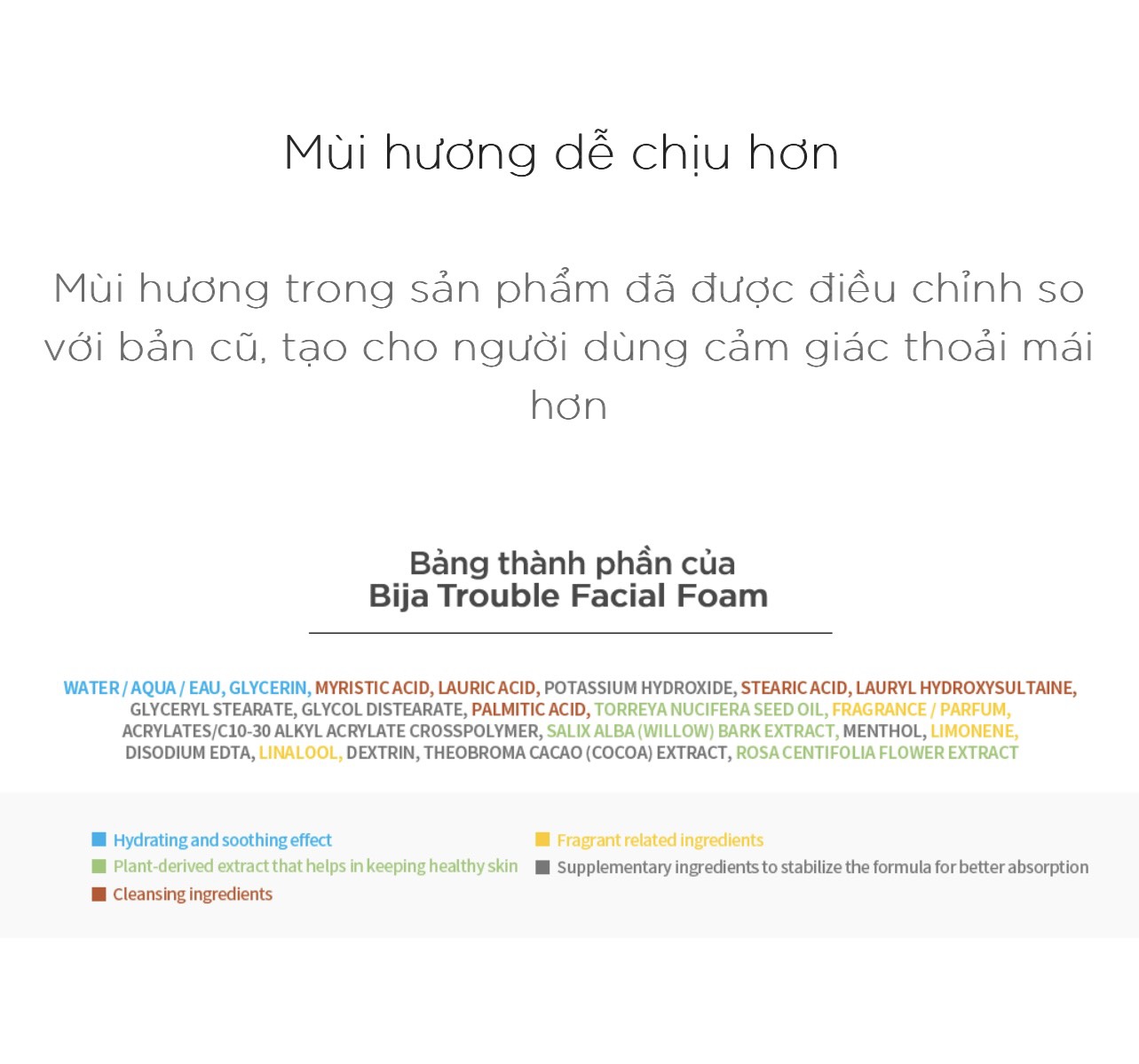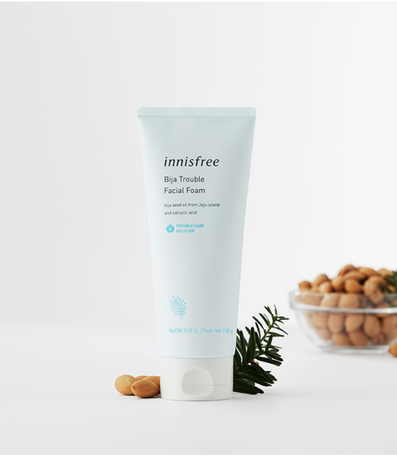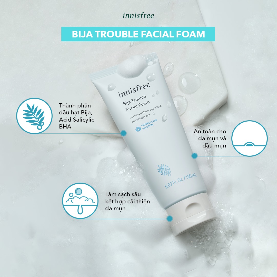 - Sữa rửa mặt Bija Trouble Facial Foam được Innisfree sản xuất với tiêu chí "5 KHÔNG" vô cùng tuyệt vời: không nước hoa nhân tạo, không dầu khoáng, không lấy nguyên liệu từ động vật, không chứa màu tổng hợp, không Imidazolidinyl urea vô cùng thân thiện với da, hoàn toàn lành tính dành cho da mẫn cảm, bị mụn và cực thích cho da dầu.
