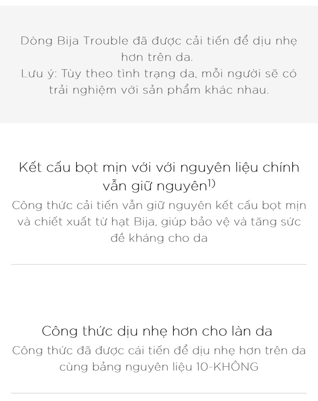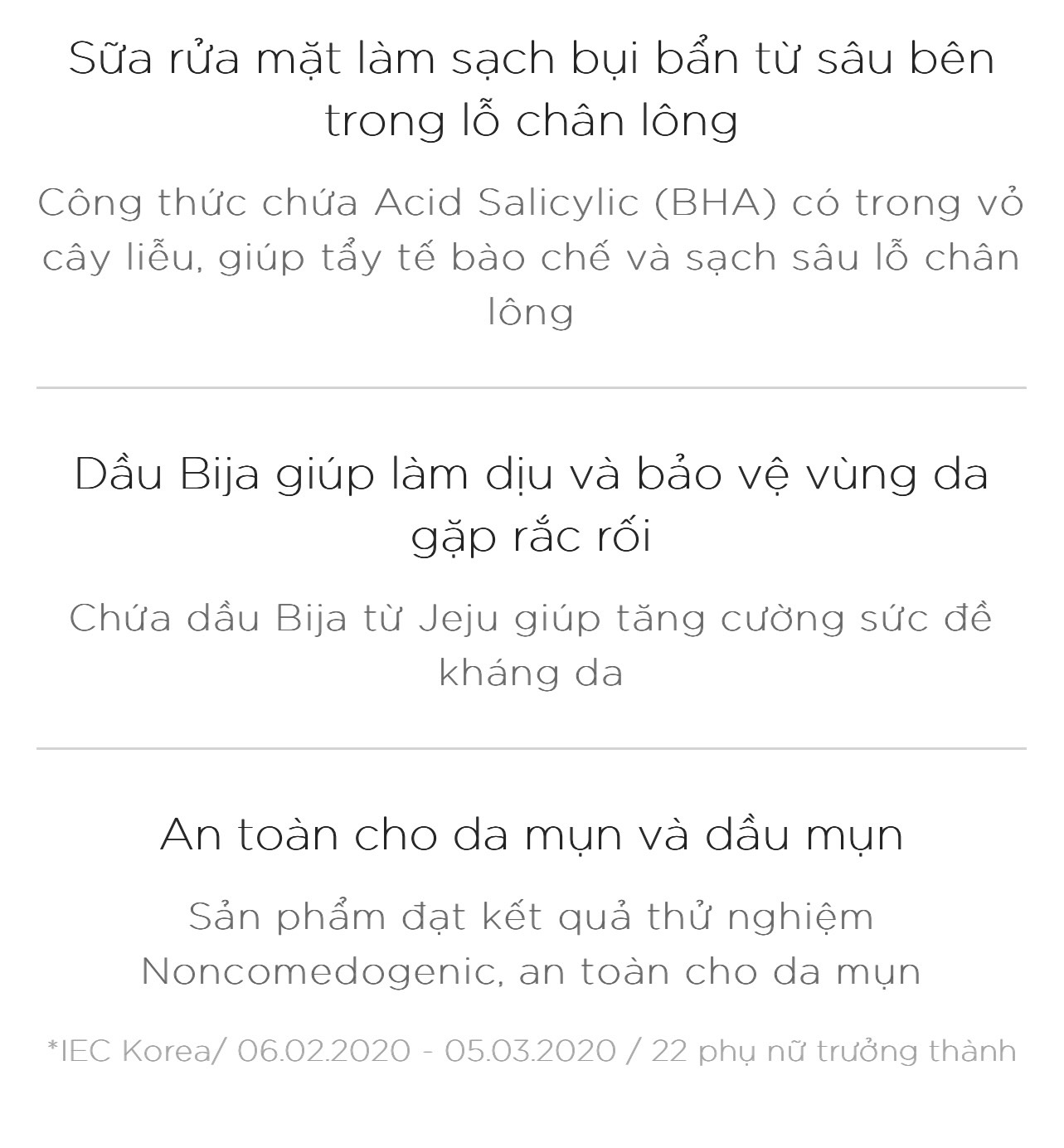 - Sản phẩm đạt kết quả thử nghiệm Noncomedogenic, an toàn cho da mụn. Dầu hạt Bija Jeju giúp làm dịu và bảo vệ vùng da gặp rắc rối về vấn đề mụn. Bọt mịn tạo cảm giác sảng khoái cho làn da dầu.