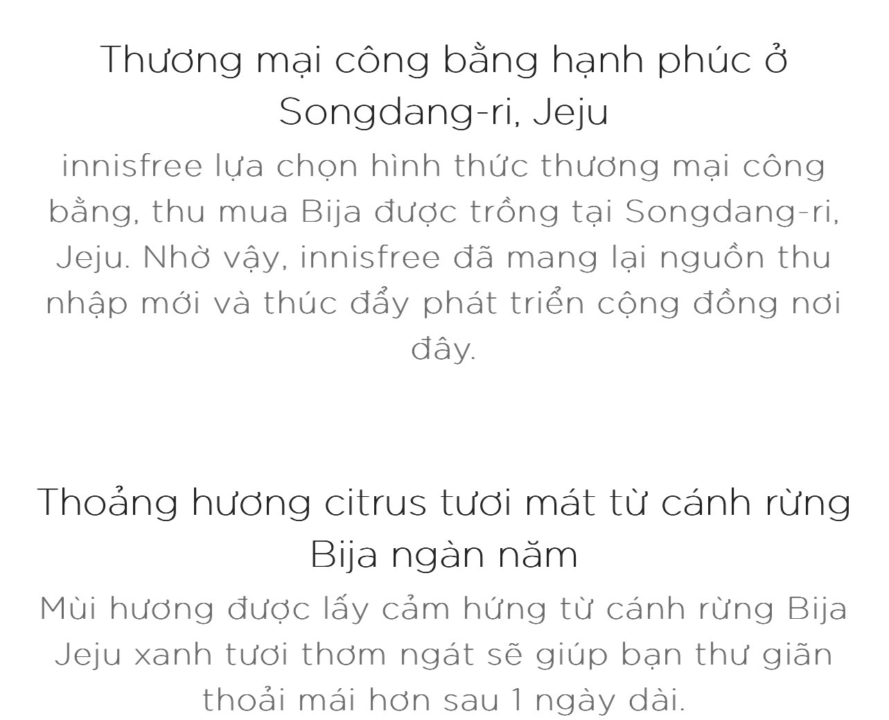 - Hạt Bija hấp thụ tinh hoa thiên nhiên suốt một khoảng thời gian dài, nhẹ nhàng làm dịu và tăng sức đề kháng cho da. Từ đó, tình trạng làn da được cải thiện đáng kể. innisfree lựa chọn hình thức thương mại công bằng, thu mua Bija được trồng tại Songdang-ri, Jeju. Nhờ vậy, innisfree đã mang lại nguồn thu nhập mới và thúc đẩy phát triển cộng đồng nơi đây.