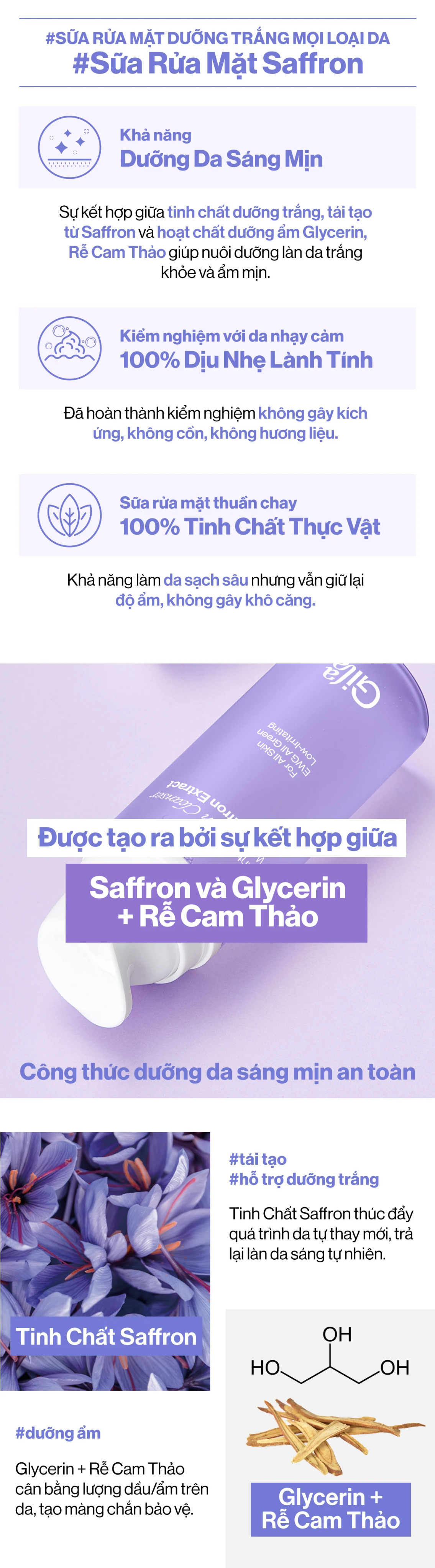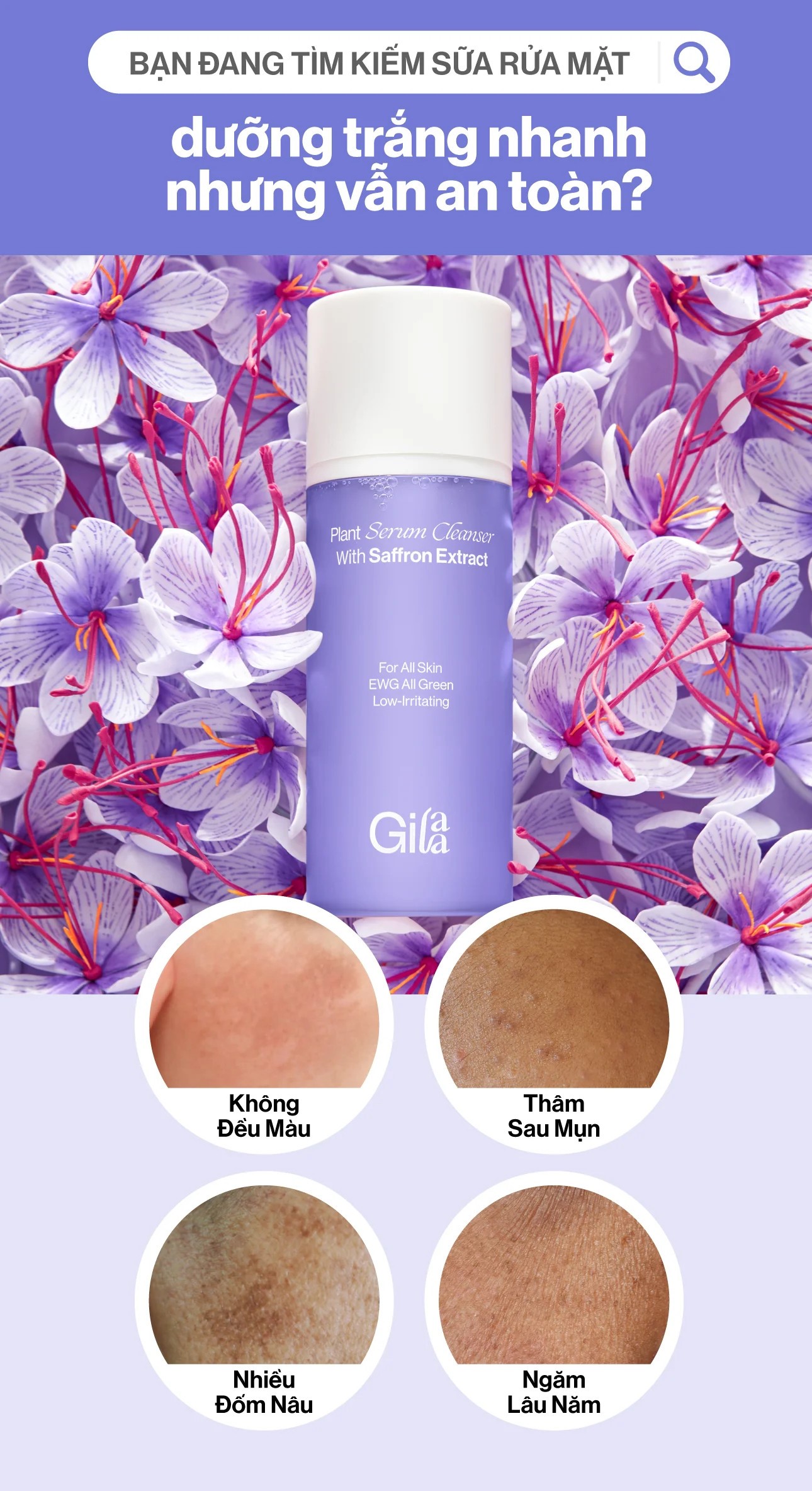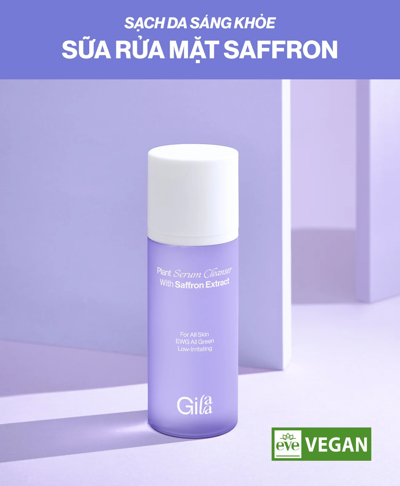 - Sữa Rửa Mặt Gilaa Plant Serum Cleanser Saffron Extract nuôi dưỡng làn da trắng khỏe, sáng mịn với 100% Tinh Chất Thực Vật giúp làm da sạch sâu nhưng vẫn giữ lại độ ẩm, không gây khô căng