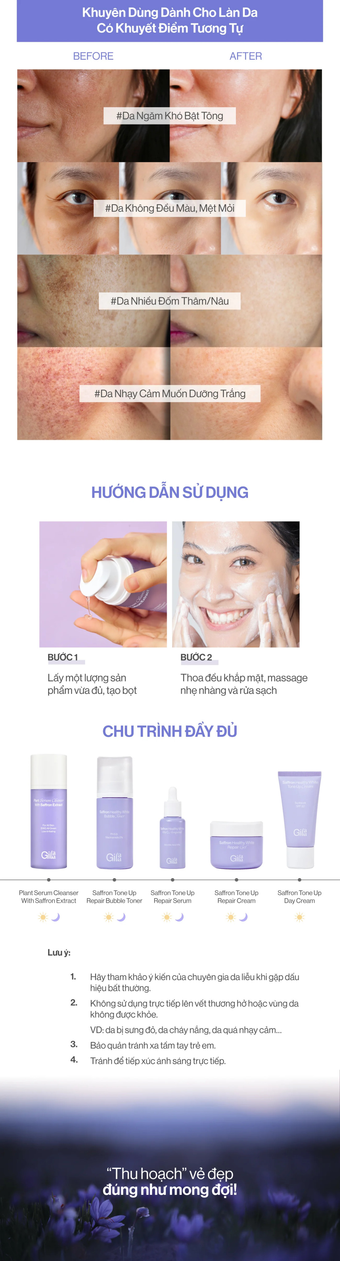 - Tinh chất Saffron (nhụy hoa Nghệ Tây): có nguồn gốc từ Hàn Quốc kết hợp cùng công nghệ độc quyền của Gilaa tăng cường khả năng dưỡng trắng và tái tạo da lên gấp 10 lần.