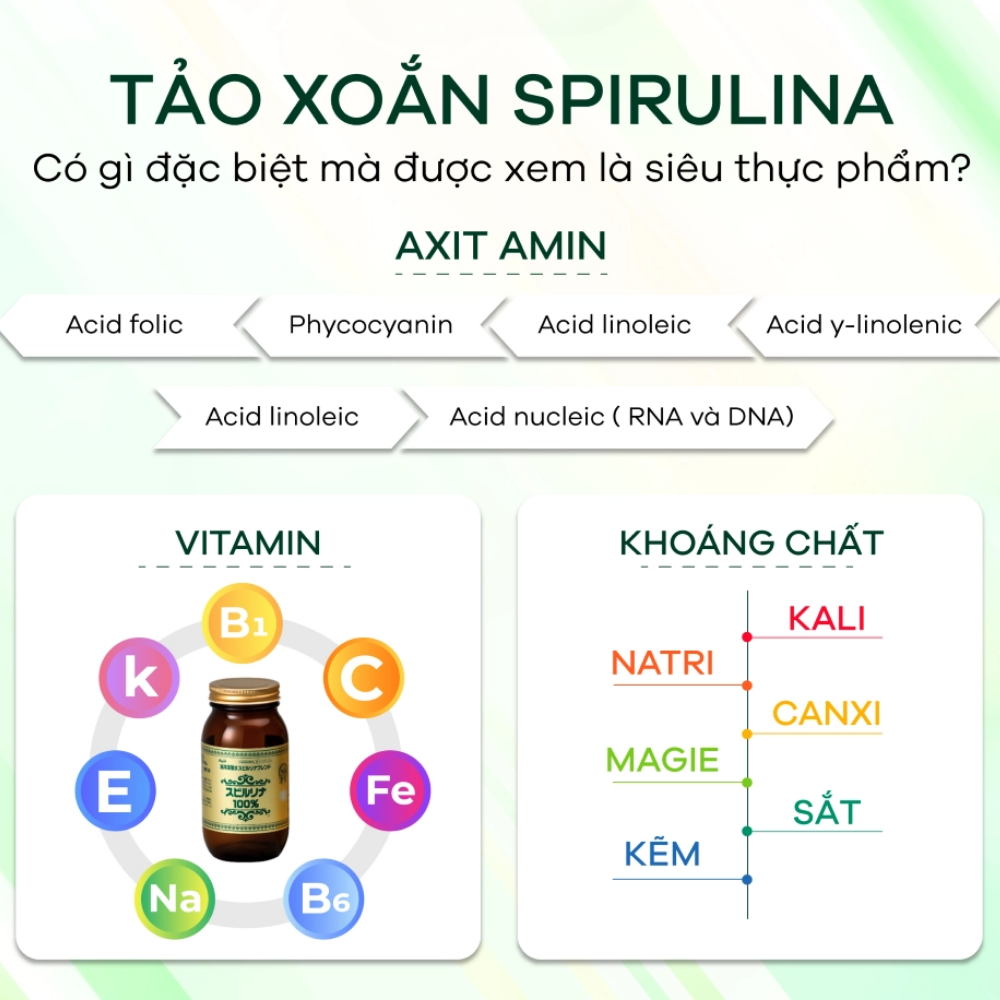 Ngoài ra, trong viên uống tảo xoắn Nhật Bản còn có các chất khoáng thiết yếu như Fe, Cu, Zn, Mn, Se,… với hàm lượng cao hỗ trợ các tế bào hình thành và hoạt hoá các enzym trong cơ thể.