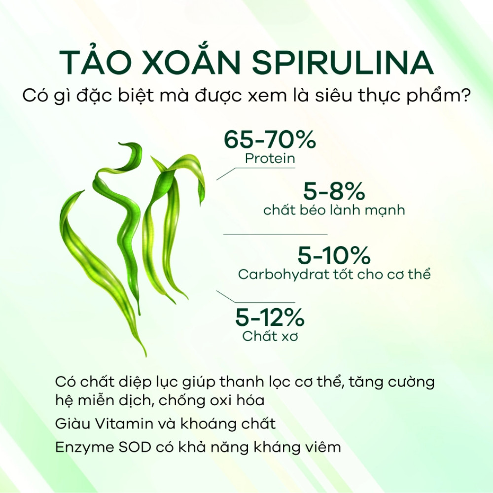 Tảo xoắn Spirulina với thành phần beta-caroten, phycocyanin, chlorophyll và polysaccharid với hàm lượng cao, có tác dụng giúp tăng cường hệ miễn dịch và sức đề kháng cho cơ thể, ức chế một số hại khuẩn và virus, đồng thời tạo môi trường thuận lợi và kích thích các lợi khuẩn đường tiêu hóa như Lactobacillus và Bifidobacterium phát triển.
