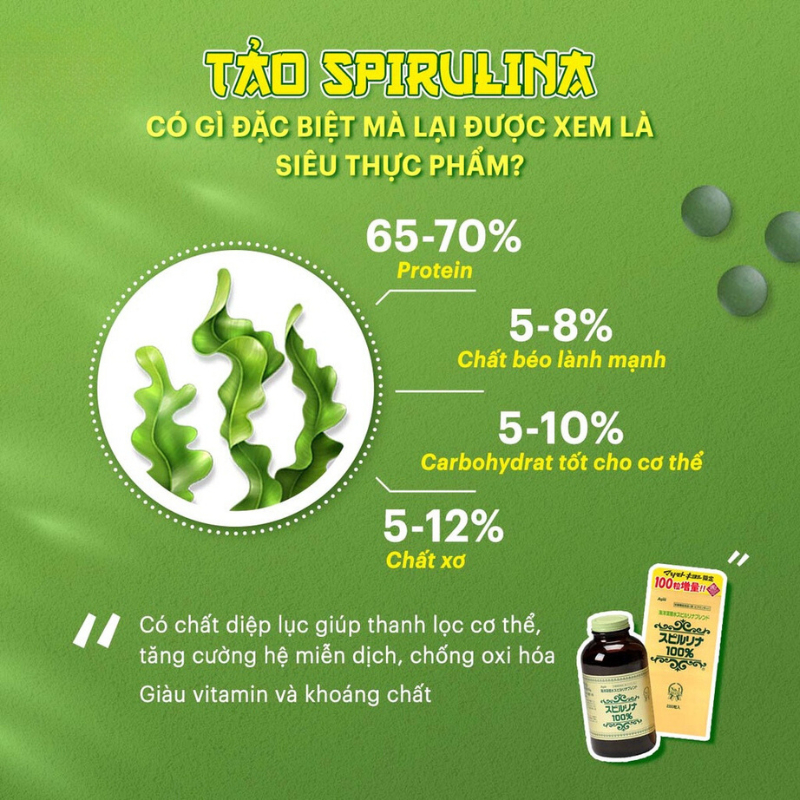 Tảo xoắn Spirulina của Nhật với các thành phần dinh dưỡng hoàn hảo, các vitamin và khoáng chất, cùng với các chất chống oxy hóa mạnh có tác dụng tích cực giúp tăng cường hoạt động chức năng gan thận, thanh lọc giải độc cơ thể ra ngoài một cách hiệu quả.