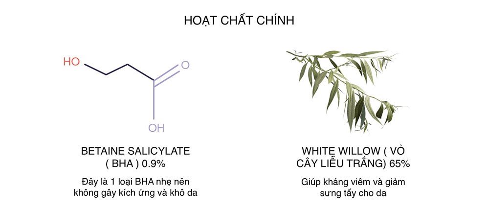 - Chứa nồng độ 4% BHA (Betaine Salicylate) và 65% chiết xuất vỏ cây liễu (Salix Alba (Willow) Bark Water) hỗ trợ làm sạch sâu lỗ chân lông, loại bỏ tế bào chết, mụn ẩn, mụn đầu đen, mụn đầu trắng, mụn đỏ, kiểm soát tuyến bã nhờn và thu nhỏ lỗ chân lông và mang lại làn da sáng khoẻ và đều màu.
