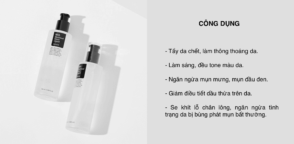 - Tẩy Tế Bào Chết Hóa Học Trị Mụn Đầu Đen, Mụn Ẩn, Lỗ Chân Lông To Cosrx BHA Blackhead Power Liquid là giải pháp dành cho làn da đang găp tình trạng mụn, với công thức chứa thành phần an toàn, dịu nhẹ và mang lại hiệu quả cao giúp tẩy tế bào chết một cách dịu nhẹ, hỗ trợ làm giảm mụn, mang đến là da sáng mịn và sạch khỏe.