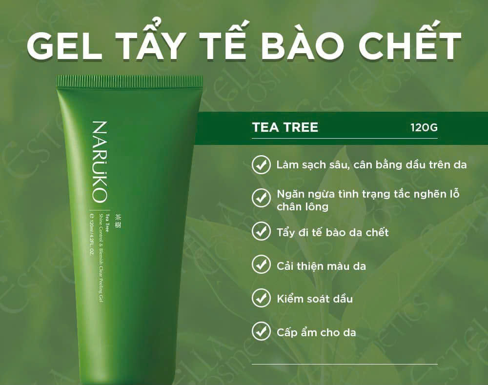 Gel Tẩy Tế Bào Chết Naruko Chiết Xuất Tràm Trà Tea Tree Shine Control and Blemish Clear Peeling Gel 120ml đến từ thương hiệu Naruko, xuất xứ Đài Loan, là giải pháp làm sạch da chuyên sâu với chiết xuất tràm trà nổi bật trong việc làm dịu da mụn, kiểm soát dầu và ngăn ngừa mụn ẩn. Sản phẩm giúp nhẹ nhàng lấy đi lớp sừng già cỗi, bụi bẩn và bã nhờn tích tụ trên bề mặt da mà không gây khô căng hay kích ứng, trả lại làn da thông thoáng và sáng mịn hơn sau mỗi lần sử dụng.
