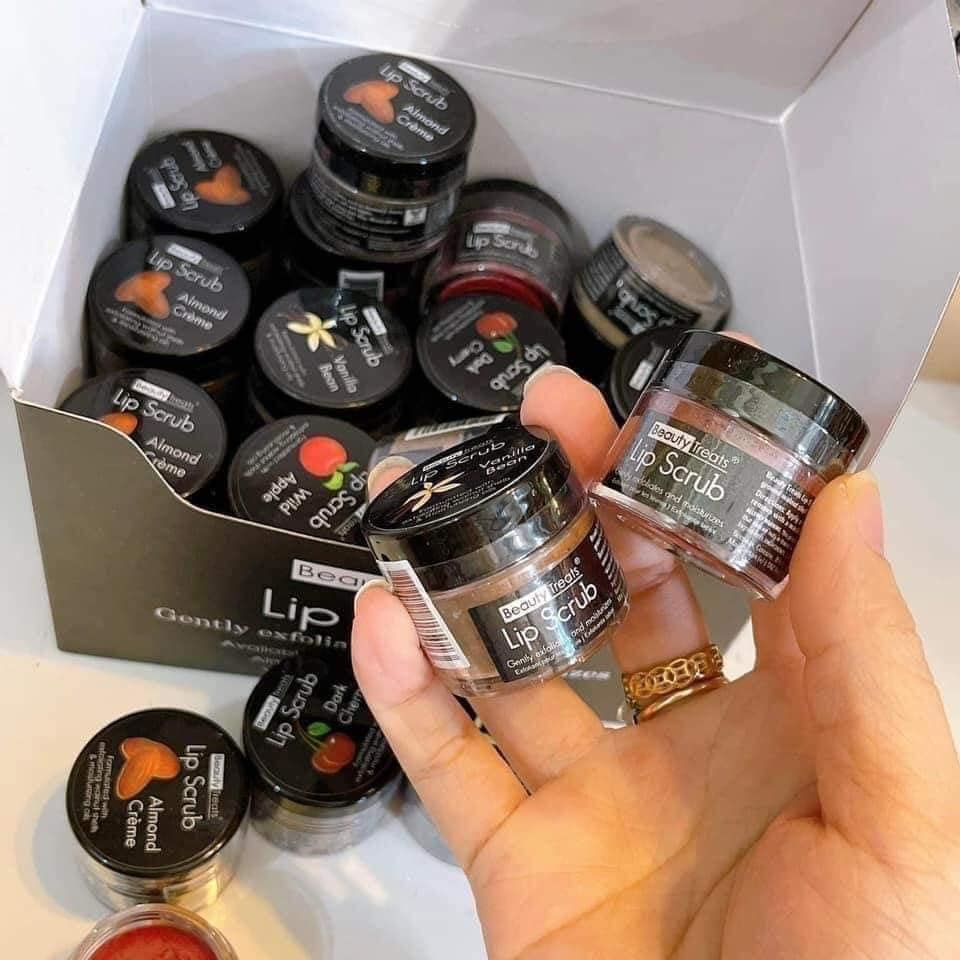- Tẩy tế bào chết cho môi Beauty Treats đến từ Mỹ với thành phần thiên nhiên, nhẹ nhàng loại bỏ lớp da chết sần sùi, nứt nẻ, bong tróc. Ngoài ra, trong thành phần sản phẩm chứa vitamin E, bơ hạt mỡ và các chiết xuất trong quả lê, nho, hạt dầu jojoba, sáp Carnauba giúp nuôi dưỡng làn môi mềm mượt, tươi tắn và căng mọng.
