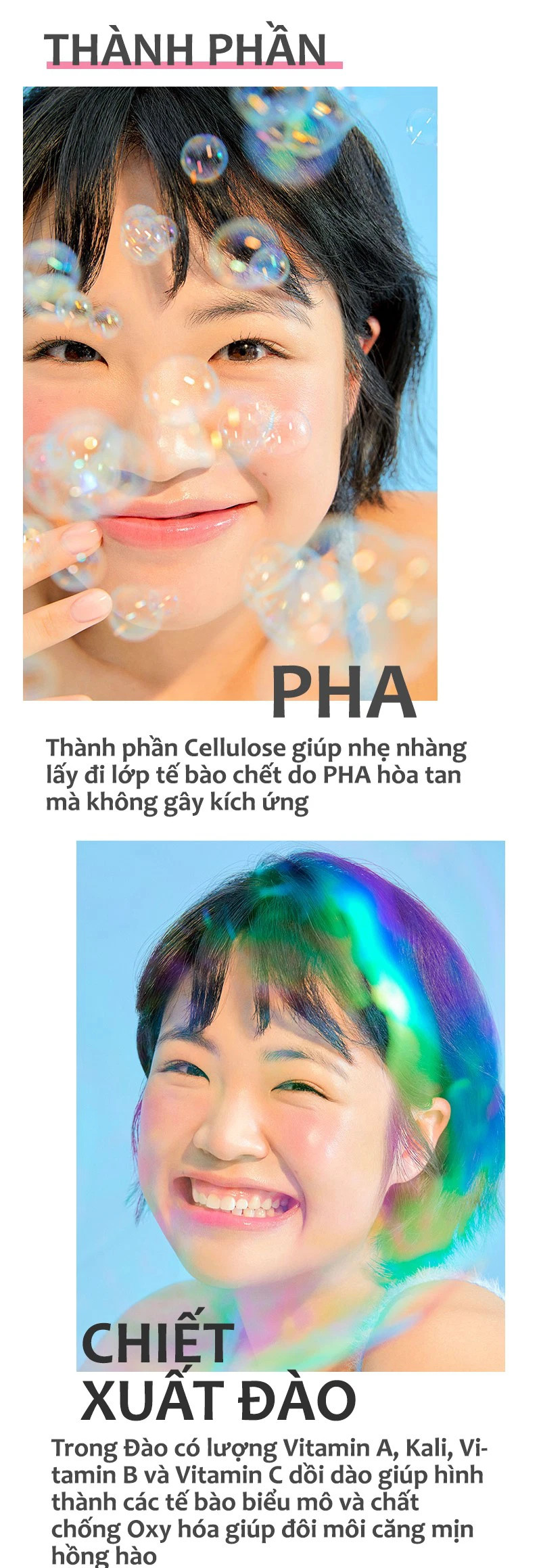 - Chứa thành phần PHA giúp hòa tan lớp tế bào chết khô bám trên bề mặt da một cách nhẹ nhàng nhất mà không gây khô hoặc kích ứng, từ đó kết cấu da môi được cải thiện trở nên mịn màng hơn. Mặc dù có cách thức hoạt động khá giống với AHA nhưng PHA còn có khả năng hút nước vào da từ các lớp sâu hơn giúp giữ ẩm cho môi hiệu quả hơn, không bị khô căng sau khi tẩy tế bào chết.
