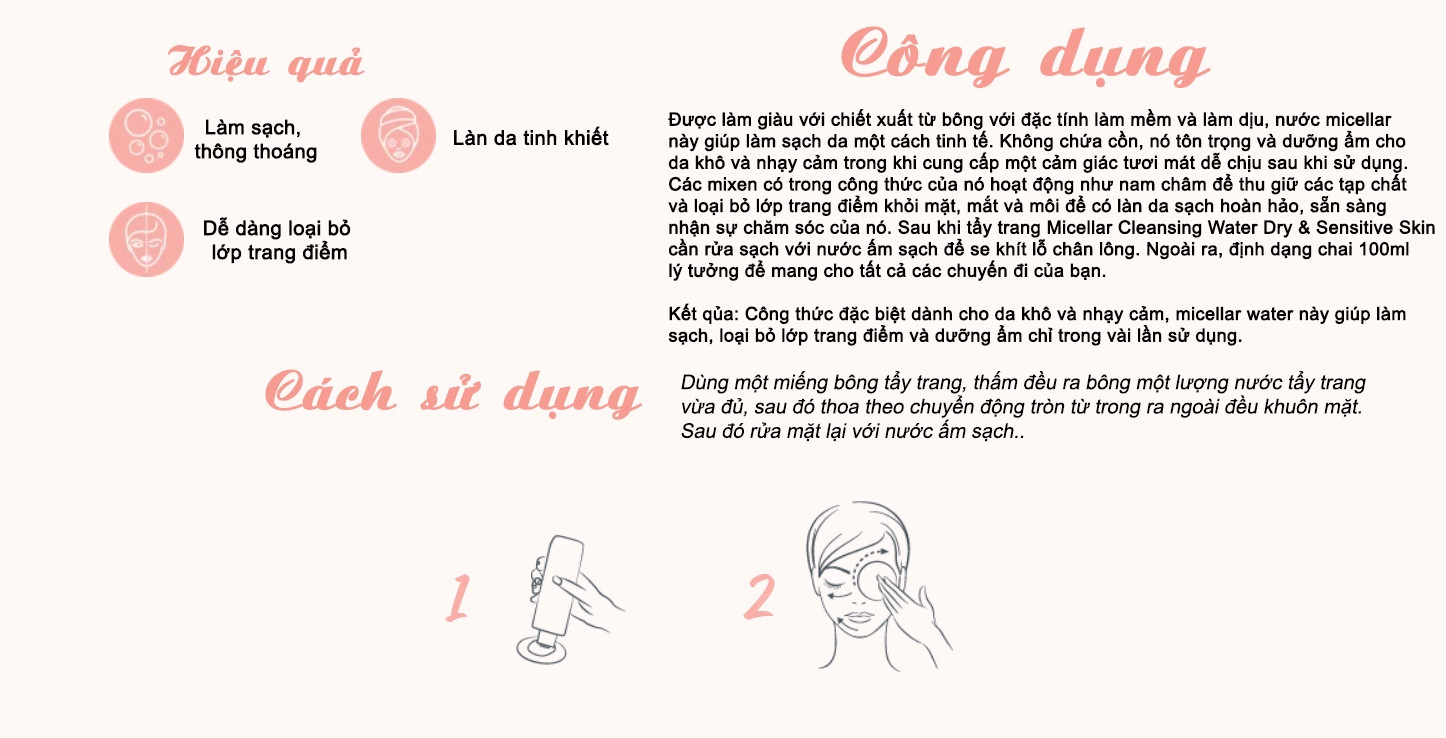 - Kết cấu dạng nước làm sạch dễ dàng với bông tẩy trang mang lại cảm giác tươi mát, ẩm mịn tức thì sau khi sử dụng.