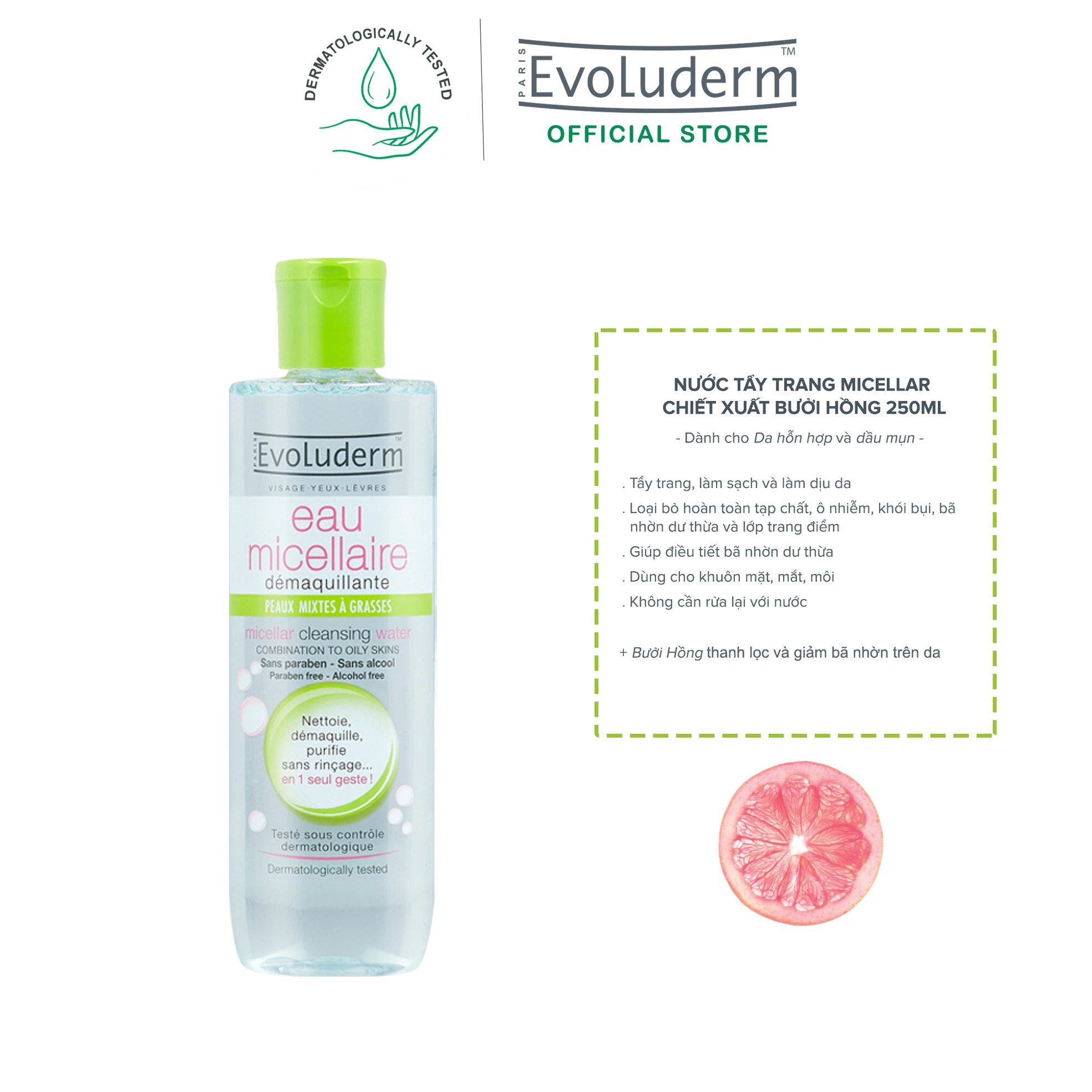 Nước tẩy trang Evoluderm Eau Micellaire Cleansing Water là dòng sản phẩm được ứng dụng công nghệ làm sạch Micellar với các phân tử Mixen đóng vai trò hút sạch toàn bộ bụi bẩn, tạp chất tận sâu bên trong lỗ chân lông và các lớp trang điểm trên da nhanh chóng mà không làm khô hay tổn thương da giúp da sạch sẽ nhẹ nhàng không cần phải kỳ rửa.