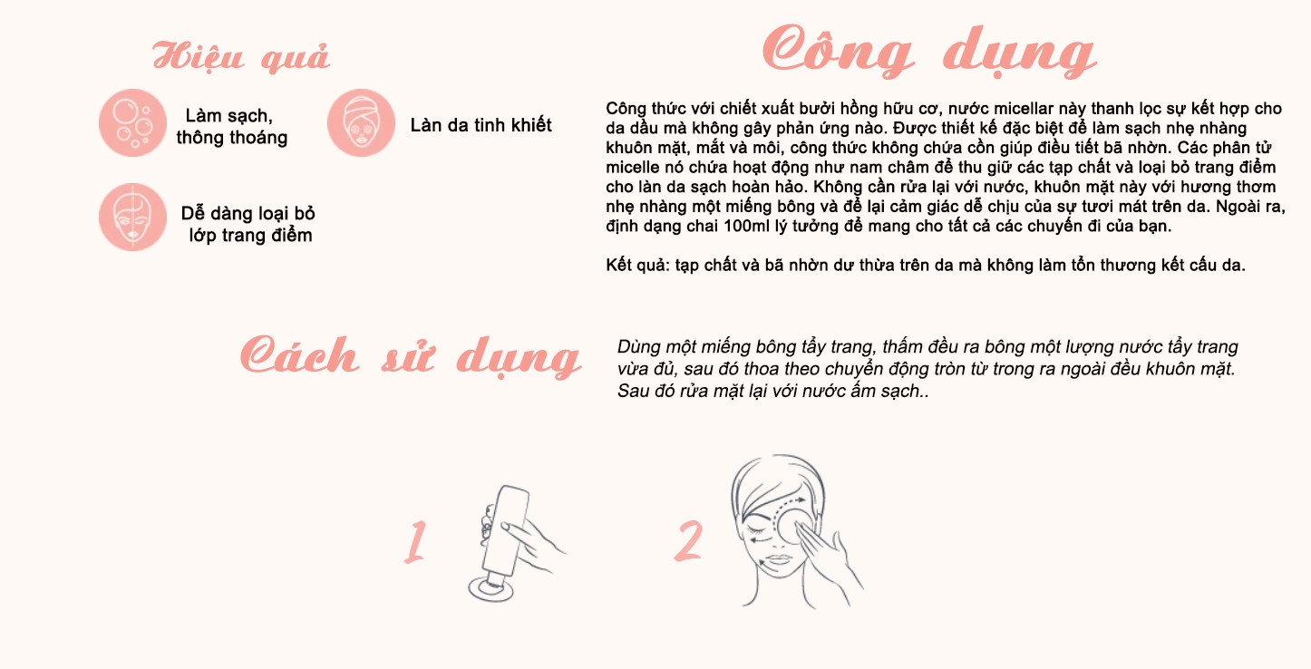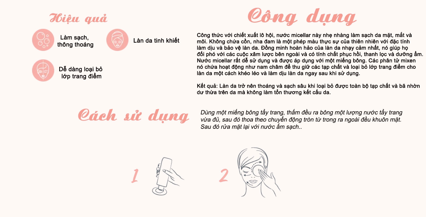 - Chứa các phân tử micellar với vô số phân tử Mixen siêu nhỏ với 1 cực ưa dầu có khả năng hút mọi bụi bẩn, dầu thừa, lớp trang điểm và 1 cực ưa nước giúp mixen dễ hòa tan và cuốn trôi mọi bụi bẩn. Đây là công nghệ được sử dụng đầu tiên tại Paris, là giải pháp giúp mang lại làn da sạch nhanh chóng.