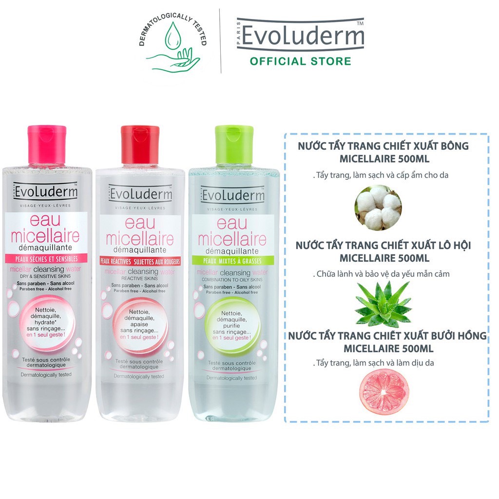 1. Nước Tẩy Trang Dành Cho Da Hỗn Hợp, Da Dầu Evoluderm Micellar Cleansing Water Combination To Oily Skins (màu xanh):
