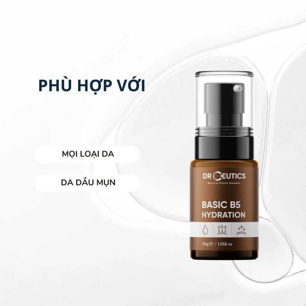 DrCeutics Tinh chất Basic B5 Hydration 30g là sản phẩm serum dưỡng da đến từ thương hiệu DrCeutics của Việt Nam, với 2 thành phần chính là Calcium Pantothenate và Sodium Hyaluronate được thiết kế theo tiêu chí ráo nhanh và khô thoáng, thích hợp cho những làn da dầu chỉ muốn dưỡng ẩm rất nhẹ nhàng. Công thức bào chế tối giản giúp cải thiện hiện tượng dị ứng, kích ứng, kể cả trên các nền da mỏng đỏ, yếu, sau treatment.