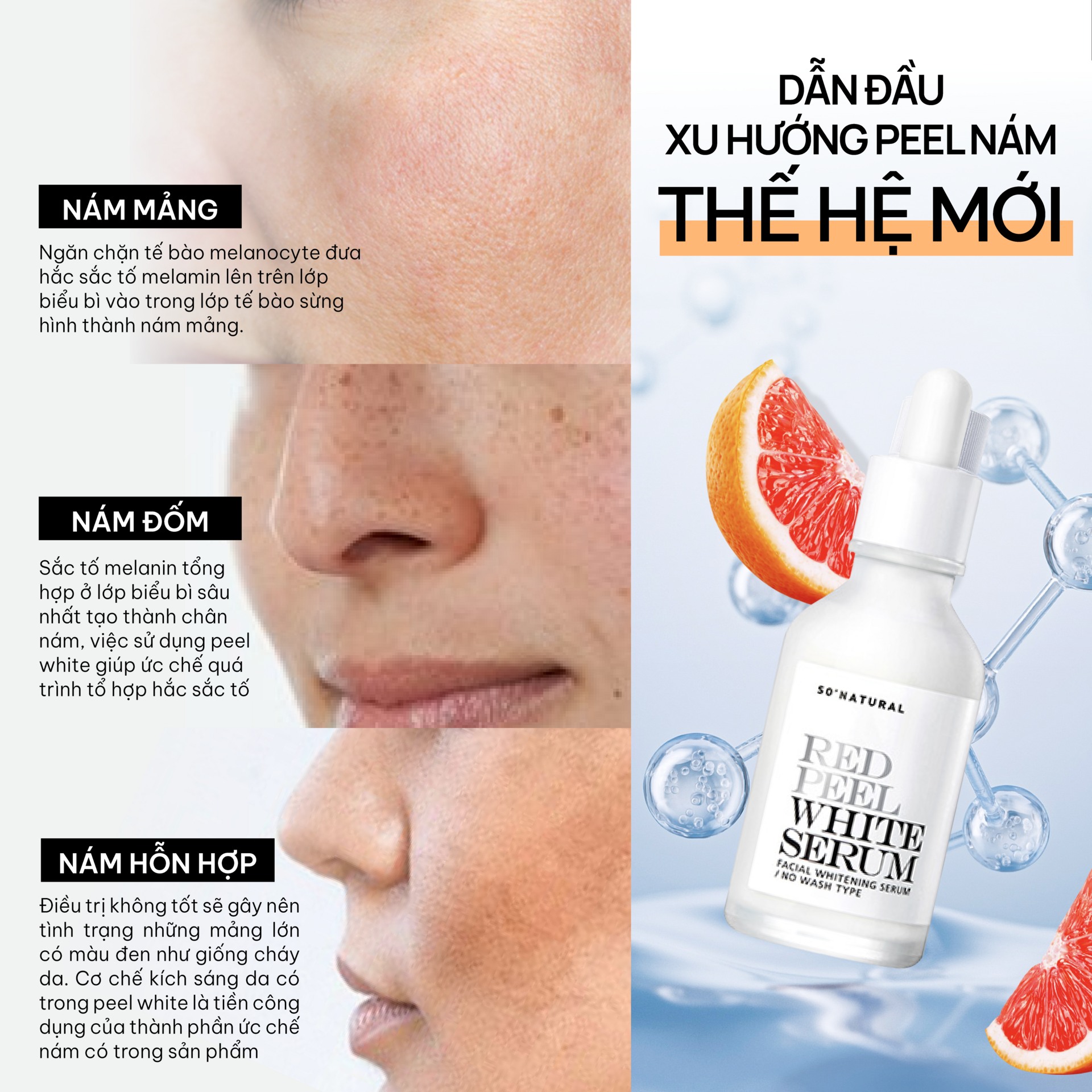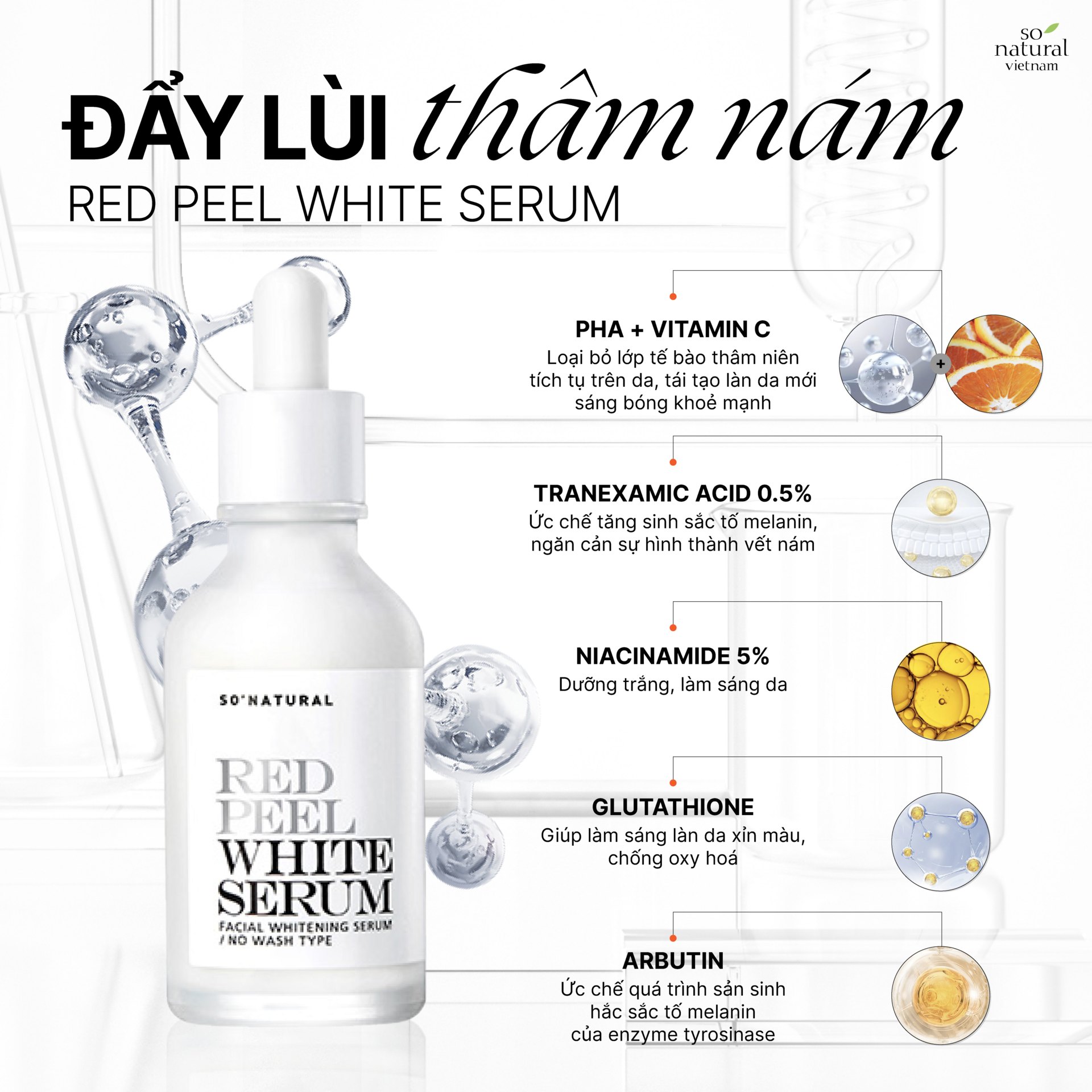 Tinh Chất So’Natural Red Peel White Serum là tinh chất ức chế nám, dưỡng trắng từ sâu bên trong, cải thiện tình trạng da lão hóa, thiếu sức sống, ngăn ngừa quá trình tăng sắc tố, giảm thâm nám, tàn nhang phù hợp với làn da nám, thâm, sạm, không đều màu.