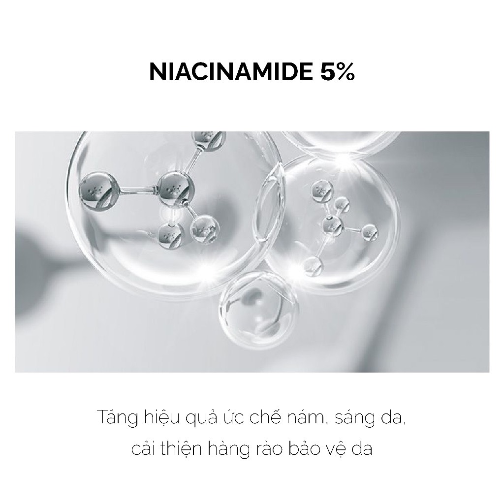 - Niacinamide 5% hỗ trợ làm giảm thâm, nám, sạm da hiệu quả do ức chế quá trình sản sinh melanin trong cơ thể, hạn chế tối đa tình trạng tăng sắc tố da. Ngoài ra, Niaciamide còn giúp cung cấp và duy trì độ ẩm cho làn da, chống oxy hoá.