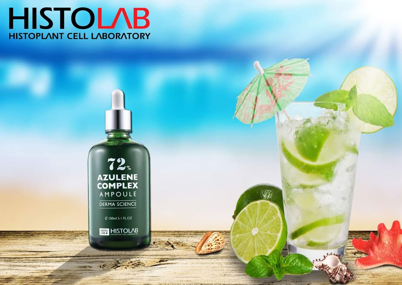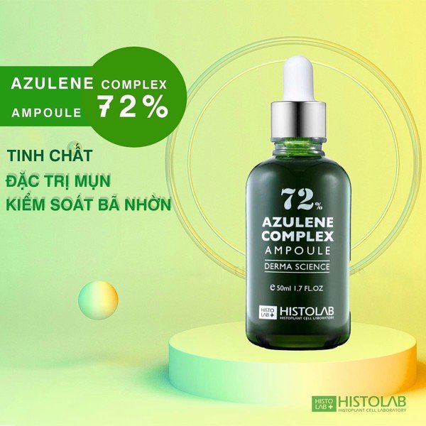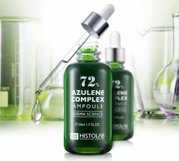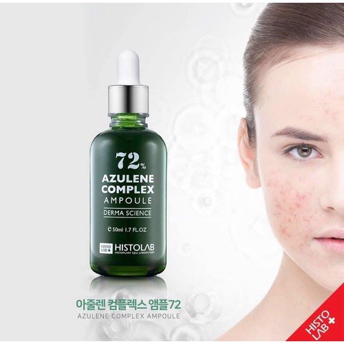 Histolab 72% Azulene Complex Ampoule Derma Science – tinh chất đặc trị với thành phần chứa 72% phức hợp Azulene cùng Dimethyl Sulfone, các chiết xuất từ thảo dược thiên nhiên,… giúp kiểm soát và điều tiết bã nhờn, trị mụn, kháng khuẩn, chống viêm, làm dịu, giảm kích ứng và sưng đỏ, hỗ trợ se khít lỗ chân lông, tăng cường miễn dịch, cân bằng độ ẩm và độ pH tự nhiên của da, thúc đẩy tái tạo tế bào mới, kích thích quá trình làm lành vết sẹo, làm mờ thâm mụn, nuôi dưỡng và phục hồi làn da sáng khỏe, tươi trẻ hơn,…