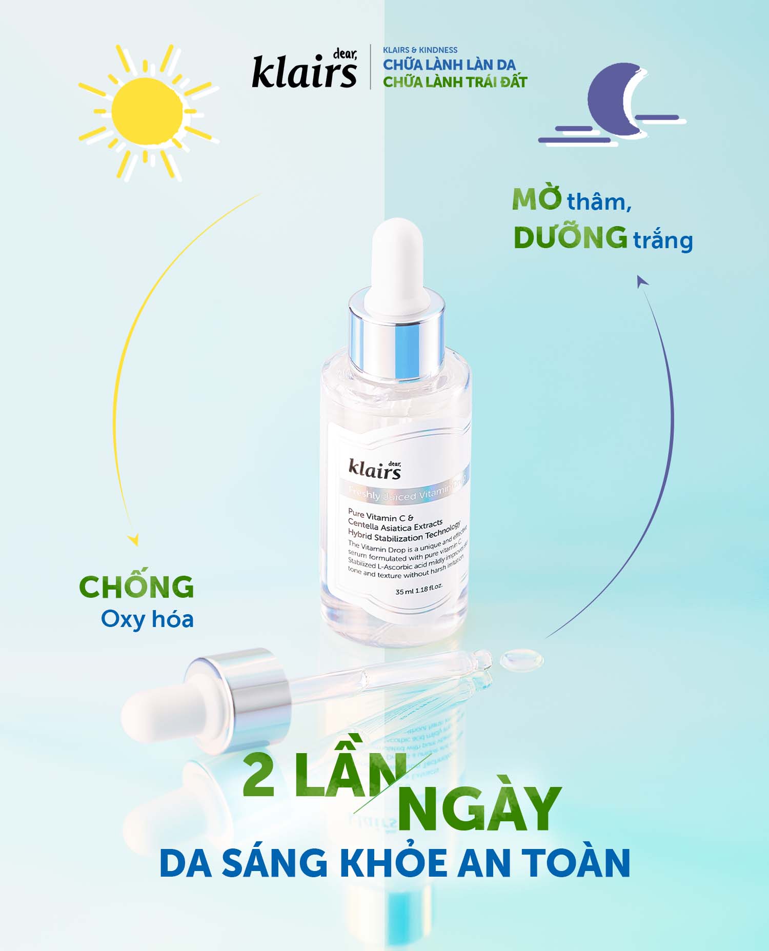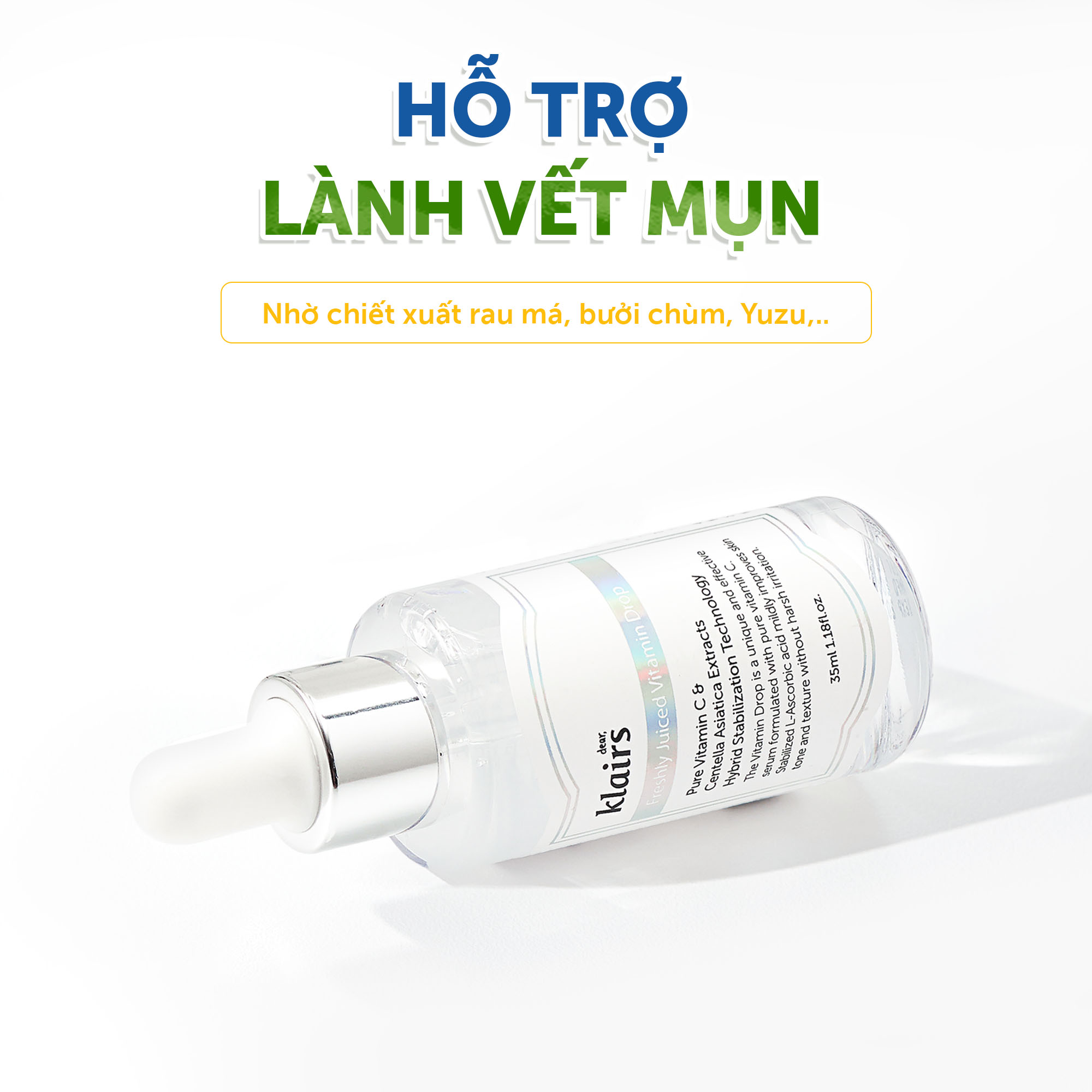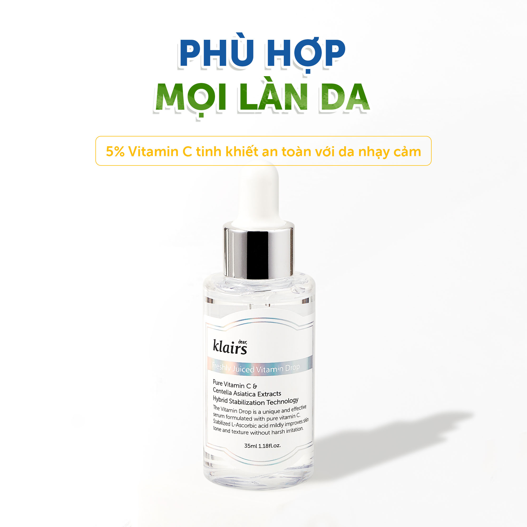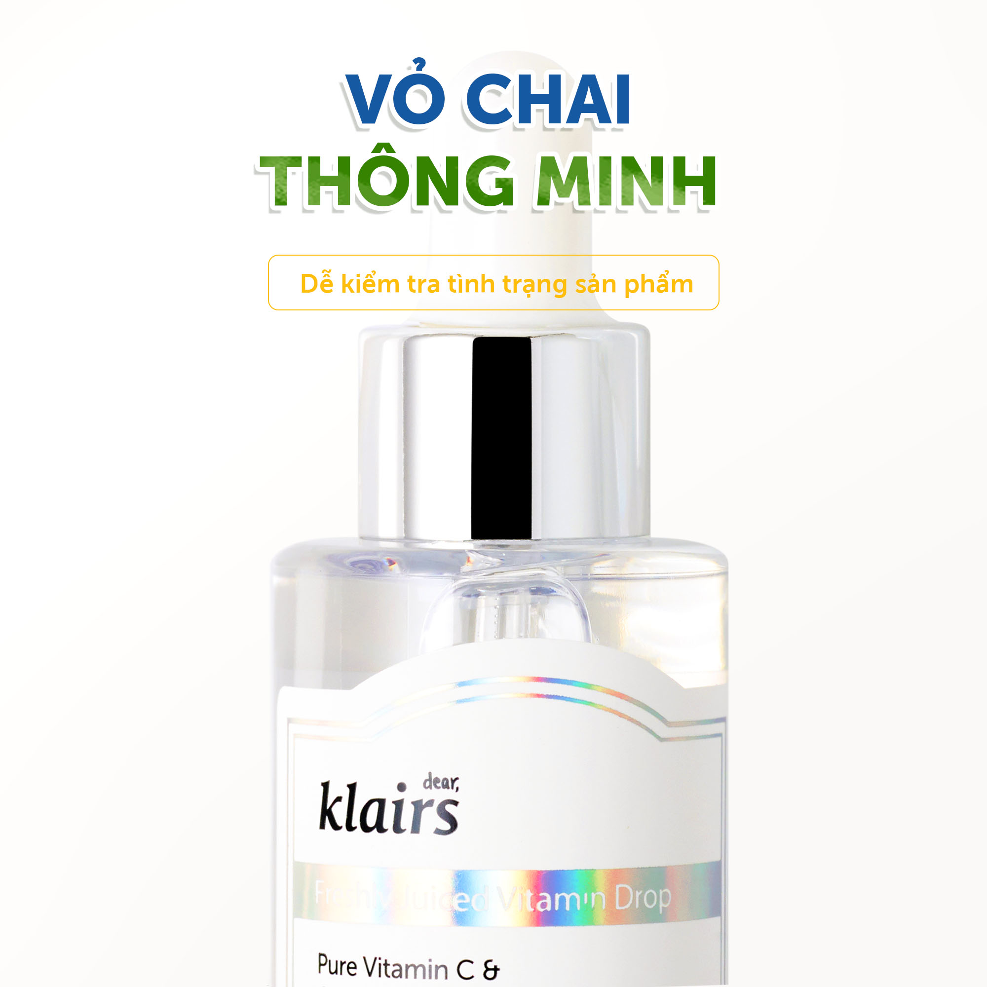 Tinh Chất Vitamin C Giúp Mờ Thâm Nám, Trắng Sáng Dành Cho Da Dễ Kích Ứng Klairs Freshly Juiced Vitamin Drop là tinh chất "siêu phẩm" chứa vitamin C tươi đậm đặc chiết xuất từ Cam, Chanh, Quýt cùng nhiều chiết xuất từ thực vật giúp tăng năng lượng và trẻ hóa làn da, an toàn với kể cả làn da nhạt cảm thuộc thương hiệu Klairs đến từ Hàn Quốc