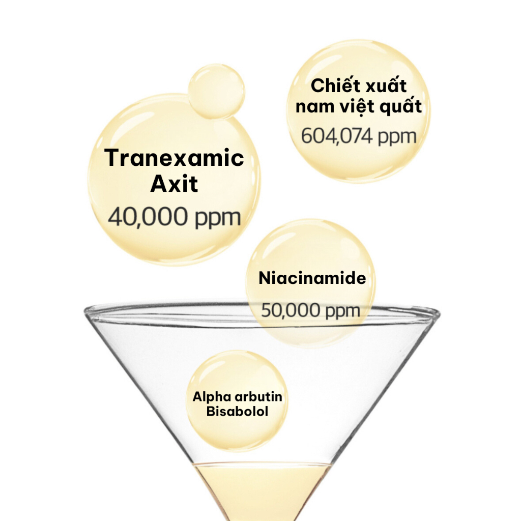 Thành phần: Vaccinium Vitis-Idaea Fruit Extract (604,074Ppm), Butylene Glycol, Niacinamide (50,000Ppm), Panthenol (50,000Ppm), Tranexamic Acid (40,000Ppm), Aqua, 1,2-Hexanediol, Neopentyl Glycol Dicaprate, Capric/Caprylic Triglycerides, Sorbitol, Bifida Ferment Filtrate, Chondrus Crispus Extract, Butyrospermum Parkii Butter, Saccharum Officinarum Extract, Alpha-Arbutin, Sodium Hyaluronate, Melia Azadirachta Flower Extract, Ocimum Sanctum Leaf Extract, Melia Azadirachta Leaf Extract, Curcuma Longa Root Extract, Corallina Officinalis Extract, Tremella Fuciformis Extract, Pentylene Glycol, Glycerin, 3-O-Ethyl Ascorbic Acid (2,000Ppm), Alpha Bisabolol, Tromethamine, Ethylhexylglycerin, Adenosine, Hydrogenated Lecithin, Allantoin, Glutathione (100Ppm), Ceramide NP, Beta-Glucan, Dipotassium Glycyrrhizate, Tocopherol, L Ascorbic Acid, Ascorbyl Glucoside, Tocopheryl Acetate, Hydroxypropyl Cyclodextrin, Ubiquinone, Alpha Lipoic Acid, Potassium Hydroxide, Behenyl Alcohol, Carbomer, Xanthan Gum, Disodium EDTA