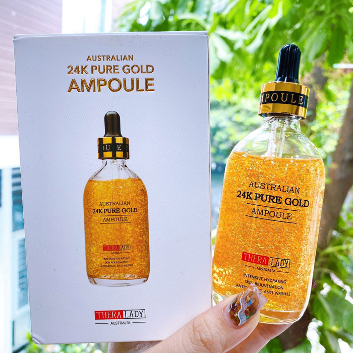 Tinh chất dưỡng da vàng 24k TheraLady Australian 24k Pure Gold Ampoule 100ml, nhãn hiệu mới của TheraLady với 99,9% Vàng 24K nguyên chất, là công thức dưỡng ẩm cho da tuyệt vời. Công thức tự nhiên với các thành phần tinh khiết, Thera Lady 24K có tác dụng chống oxy hóa với vàng thu hút các ion từ da của bạn mang lại cảm giác sạch tinh khiết. Các hoạt chất có trong tinh chất dưỡng da 24k TheraLady Australian 24k Pure Gold Ampoule còn giúp sản sinh collagen, thúc đẩy quá trình miễn dịch cho làn da, làm chậm quá trình lão hóa da giúp da trở nên tươi trẻ, tràn đầy sức sống.