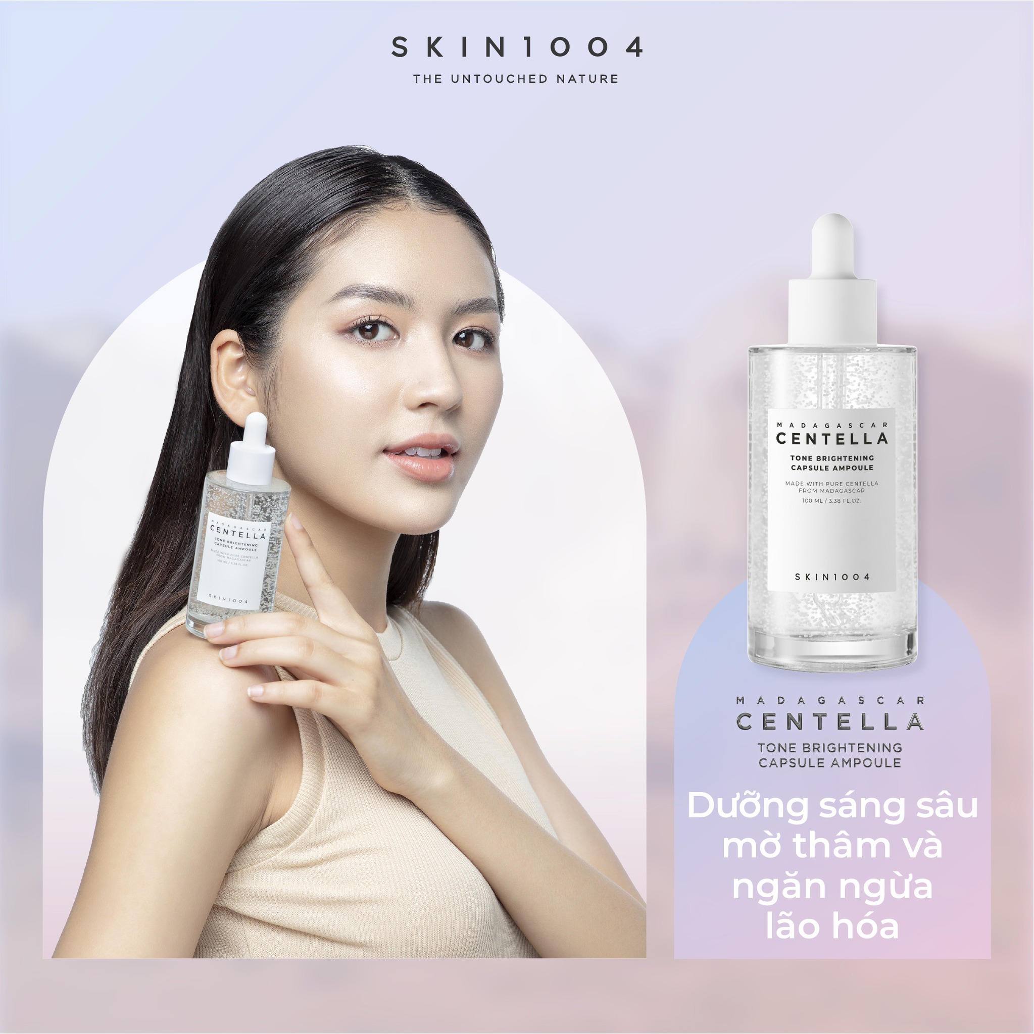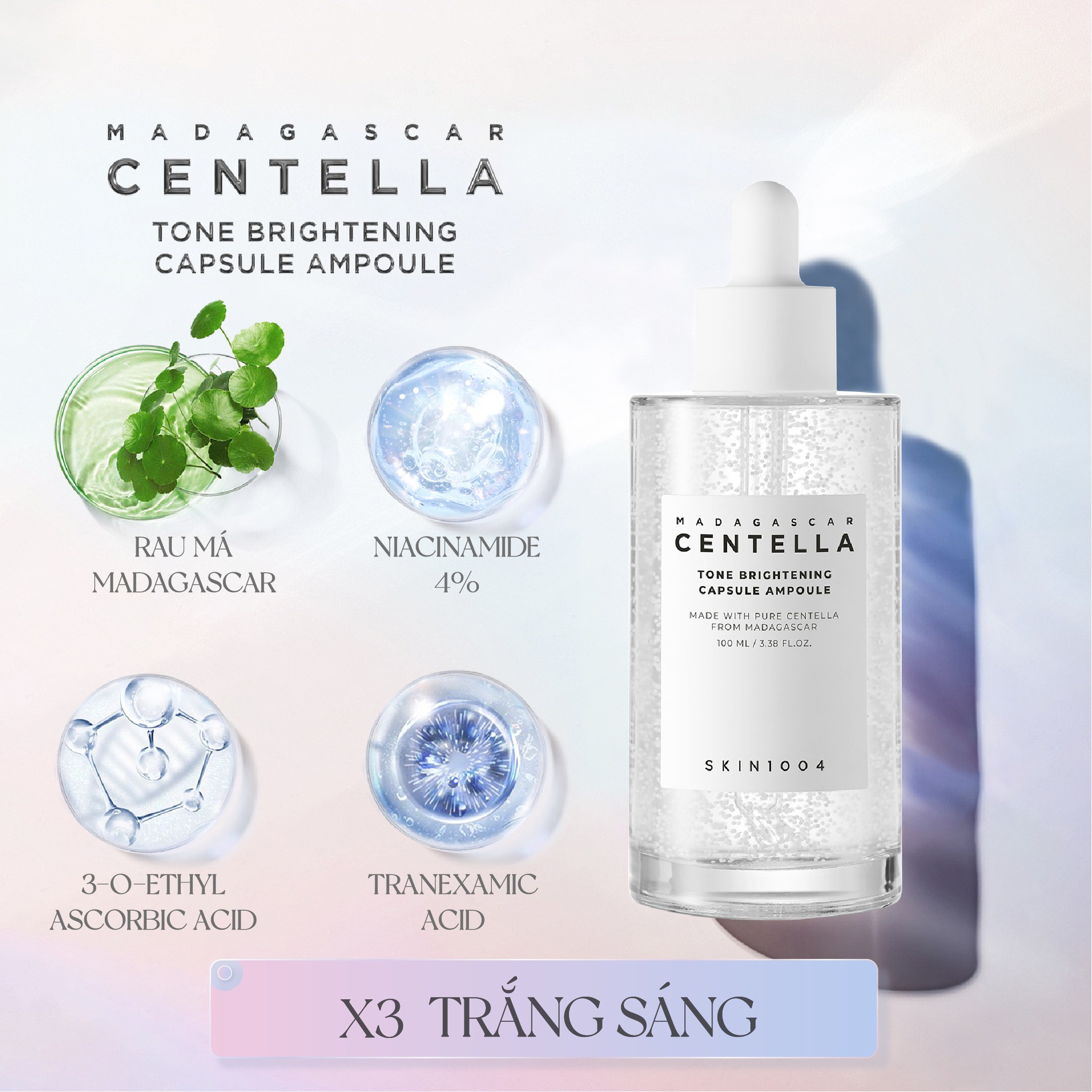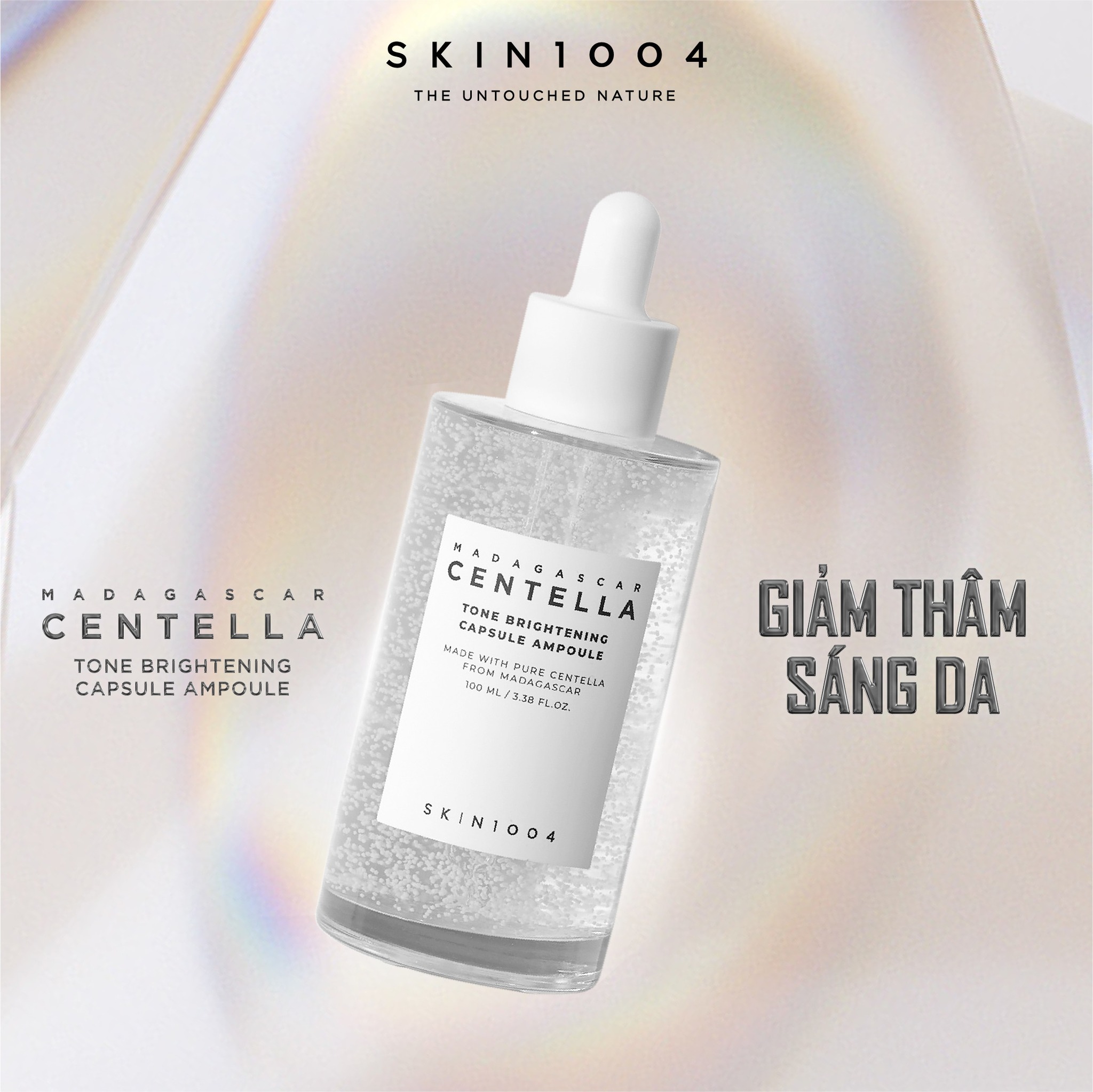 Tinh Chất Tone Brightening Capsule Ampoule 100ml là dòng tinh chất dưỡng da thuộc thương hiệu Skin1004 đến từ Hàn Quốc. Với công thức thành phần được cấp bằng sáng chế Madewhite™ chiết xuất từ rau má cùng với phức hợp dưỡng trắng gấp 3 lần bao gồm Niacinamide, Axit tranexamic và 3-o-Ethyl Ascorbic Acid giúp da trắng sáng đều màu, đồng thời hỗ trợ làm dịu và giảm kích ứng trên làn da nhạy cảm.