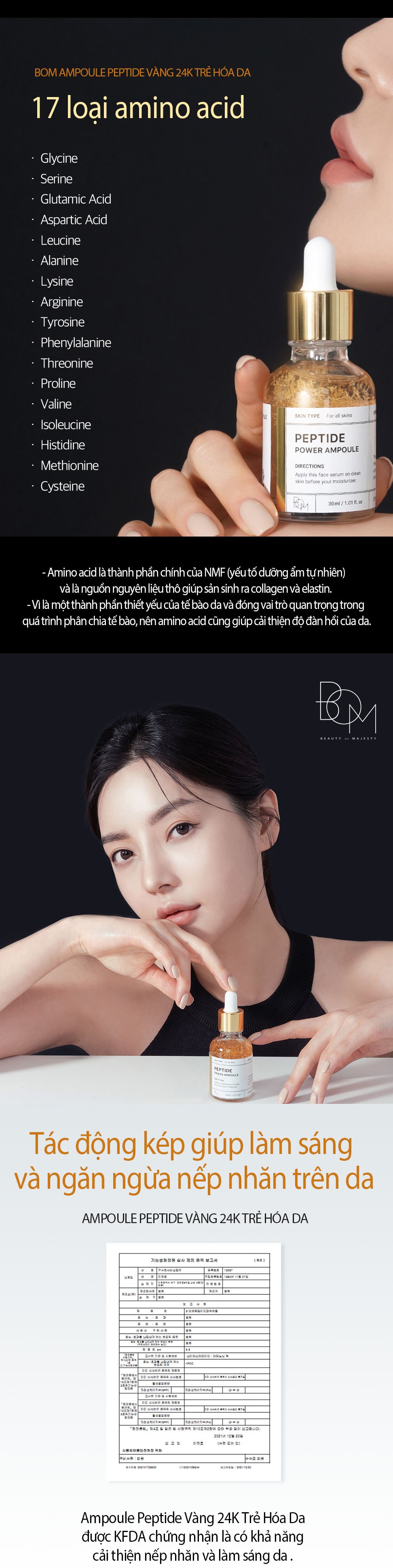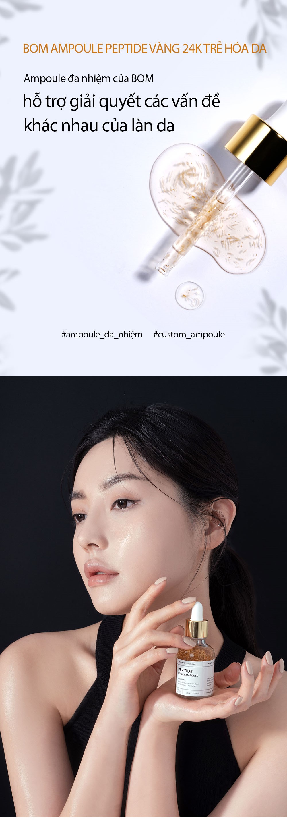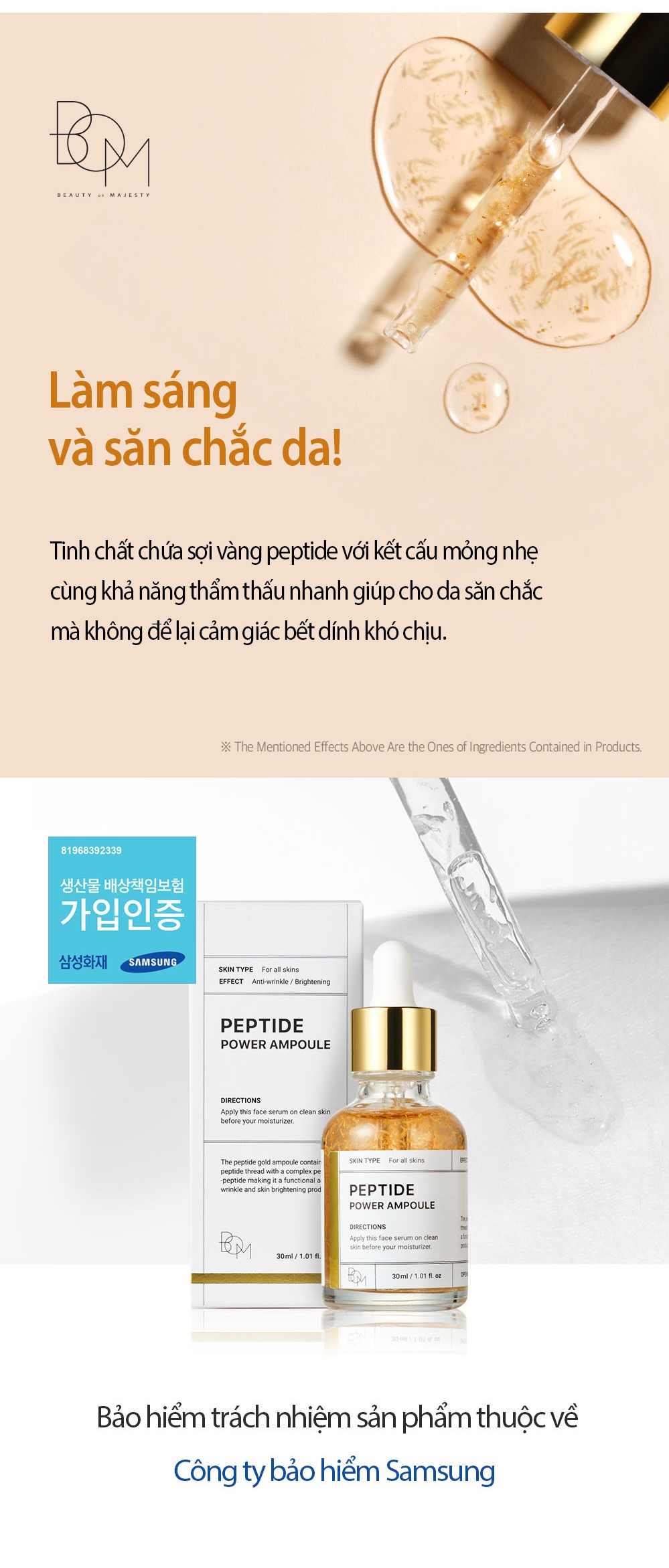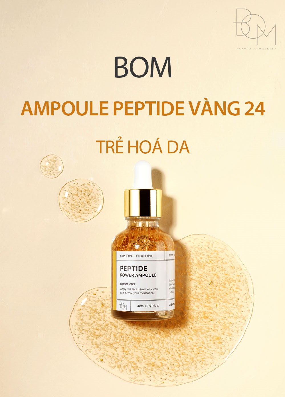 Tinh Chất Vàng 24K Làm Sáng Và Săn Chắc Da B.O.M Peptide Power Ampoule là serum đến từ thương hiệu mỹ phẩm B.O.M của Hàn Quốc, với công dụng đa nhiệm giúp hỗ trợ giải quyết nhiều vấn đề khác nhau của làn da. Sản phẩm có chứa 5 loại sợi peptide và vàng 24k giúp tăng khả năng hấp thụ dưỡng chất, mang lại sức sống và tạo độ đàn hồi cho da.
