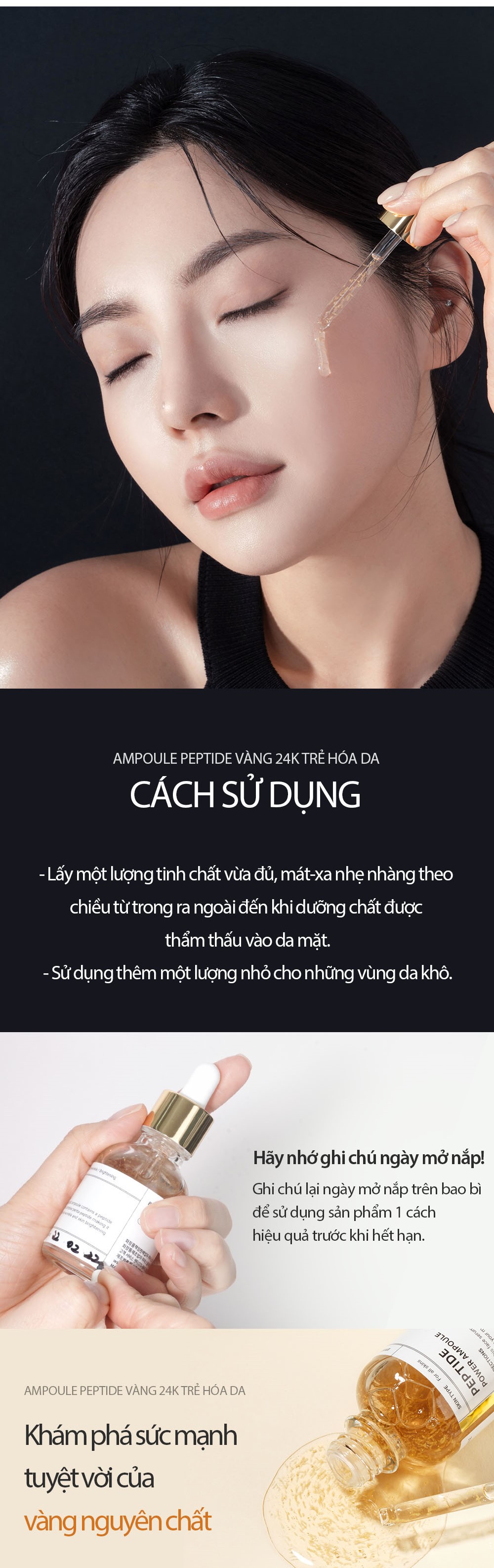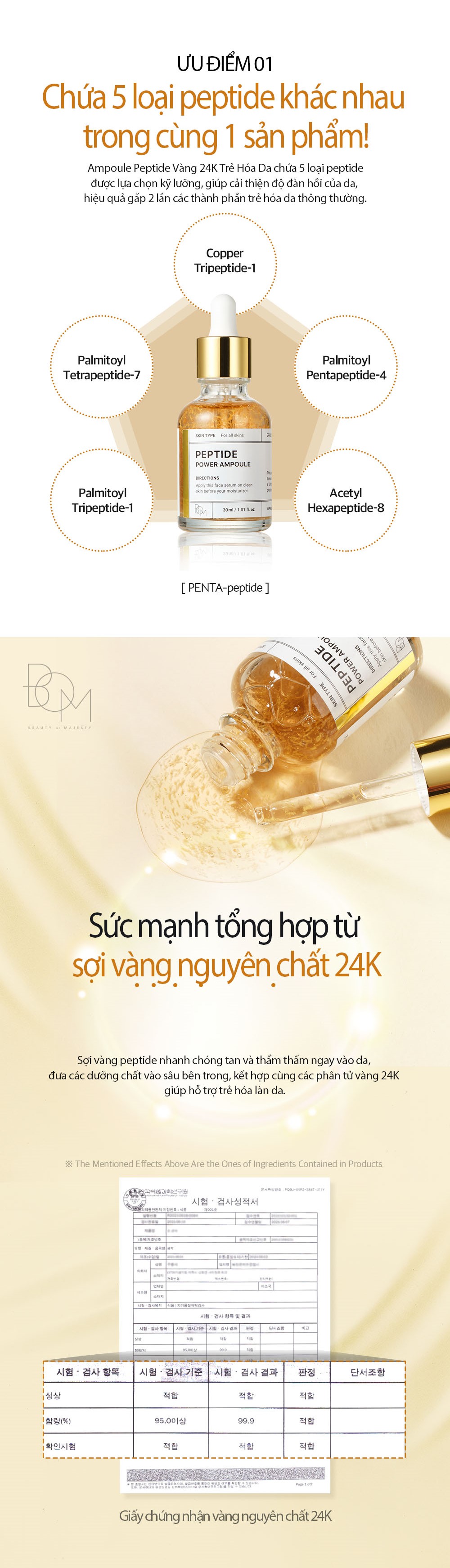 - Thành phần nổi bật peptide vàng 24K giúp săn chắc làn da có chứa 5 loại peptide giúp cải thiện độ đàn hồi của da hiệu quả gấp 2 lần các thành phần trẻ hóa da thông thường. 5 loại peptide bao gồm: